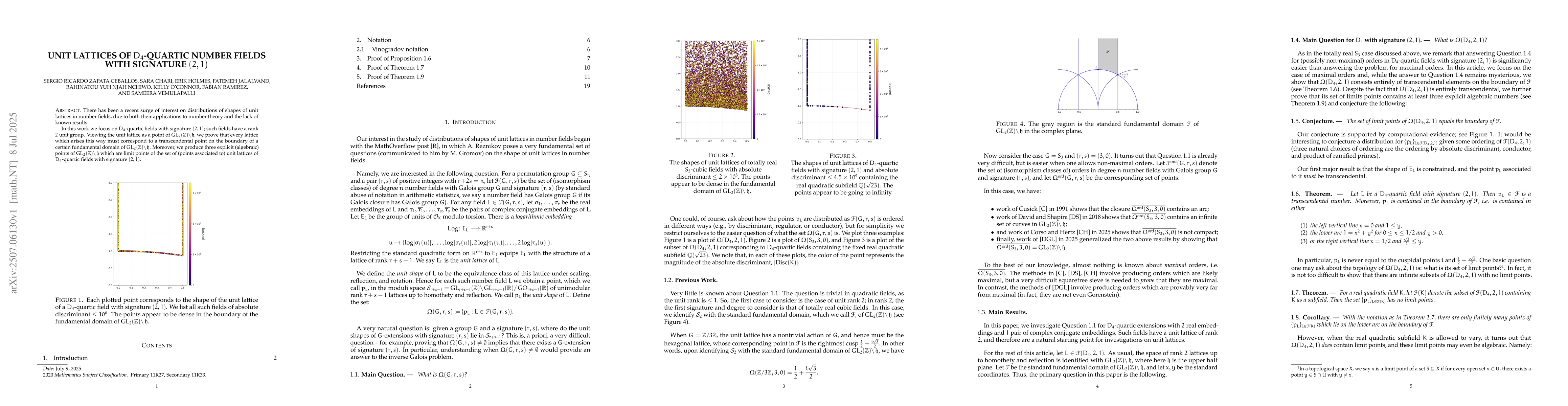 There has been a recent surge of interest on distributions of shapes of unit lattices in number fields, due to both their applications to number theory and the lack of known results. In this work we focus on $D_4$-quartic fields with signature $(2,1)$; such fields have a rank $2$ unit group. Viewing the unit lattice as a point of $GL_2(\mathbb{Z})\backslash \mathfrak{h}$, we prove that every lattice which arises this way must correspond to a transcendental point on the boundary of a certain fundamental domain of $GL_2(\mathbb{Z})\backslash \mathfrak{h}$. Moreover, we produce three explicit (algebraic) points of $GL_2(\mathbb{Z})\backslash \mathfrak{h}$ which are limit points of the set of (points associated to) unit lattices of $D_4$-quartic fields with signature $(2,1)$.