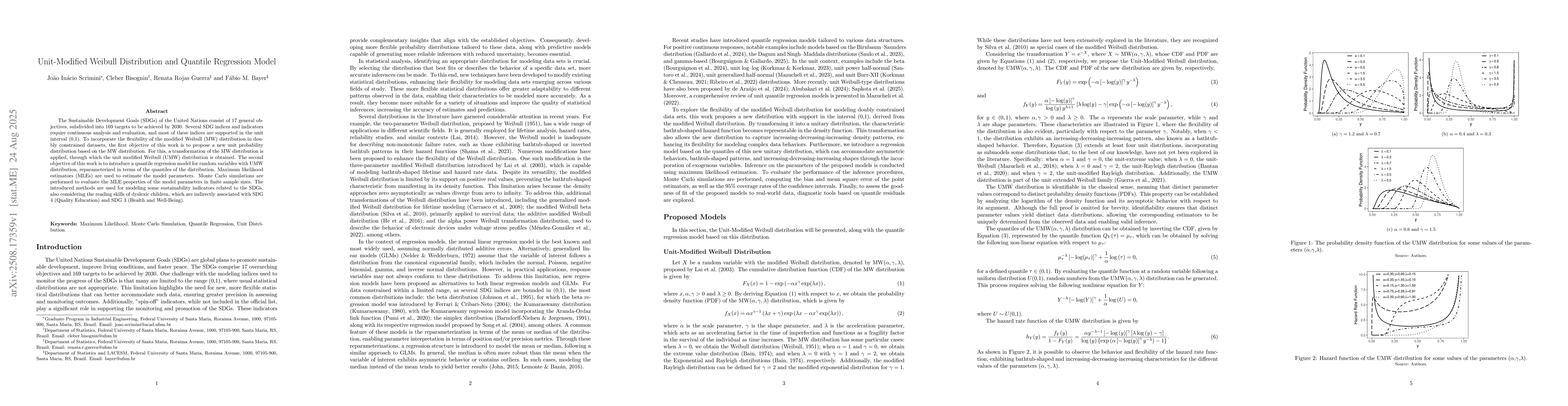 The Sustainable Development Goals (SDGs) of the United Nations consist of 17 general objectives, subdivided into 169 targets to be achieved by 2030. Several SDG indices and indicators require continuous analysis and evaluation, and most of these indices are supported in the unit interval (0,1). To incorporate the flexibility of the modified Weibull (MW) distribution in doubly constrained datasets, the first objective of this work is to propose a new unit probability distribution based on the MW distribution. For this, a transformation of the MW distribution is applied, through which the unit modified Weibull (UMW) distribution is obtained. The second objective of this work is to introduce a quantile regression model for random variables with UMW distribution, reparameterized in terms of the quantiles of the distribution. Maximum likelihood estimators (MLEs) are used to estimate the model parameters. Monte Carlo simulations are performed to evaluate the MLE properties of the model parameters in finite sample sizes. The introduced methods are used for modeling some sustainability indicators related to the SDGs, also considering the reading skills of dyslexic children, which are indirectly associated with SDG 4 (Quality Education) and SDG 3 (Health and Well-Being).