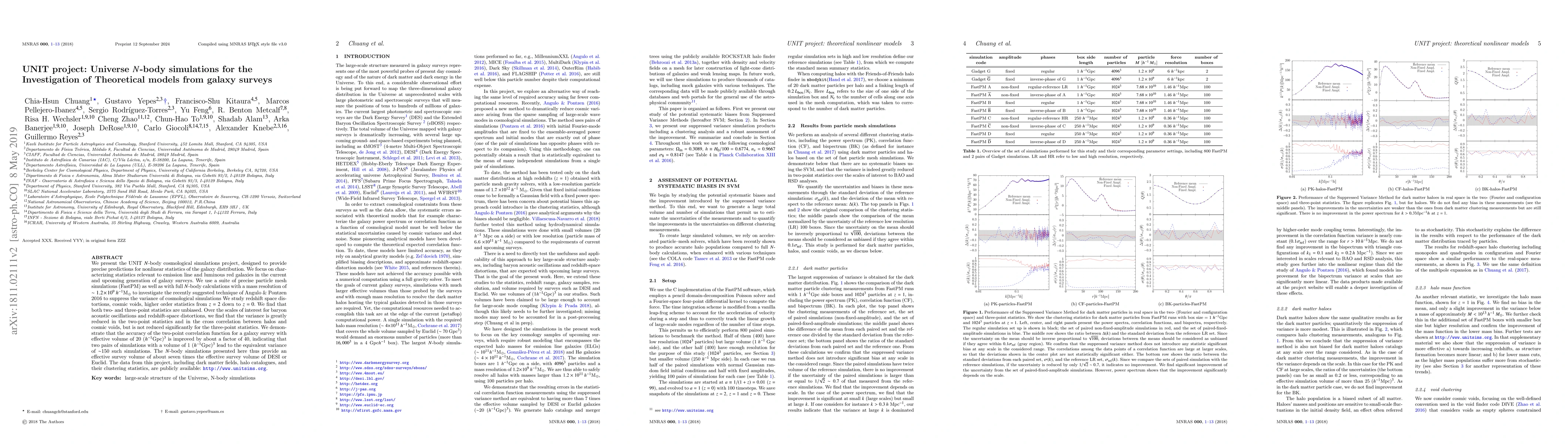 We present the UNIT $N$-body cosmological simulations project, designed to provide precise predictions for nonlinear statistics of the galaxy distribution. We focus on characterizing statistics relevant to emission line and luminous red galaxies in the current and upcoming generation of galaxy surveys. We use a suite of precise particle mesh simulations (FastPM) as well as with full $N$-body calculations with a mass resolution of $\sim 1.2\times10^9\,h^{-1}$M$_{\odot}$ to investigate the recently suggested technique of Angulo & Pontzen 2016 to suppress the variance of cosmological simulations We study redshift space distortions, cosmic voids, higher order statistics from $z=2$ down to $z=0$. We find that both two- and three-point statistics are unbiased. Over the scales of interest for baryon acoustic oscillations and redshift-space distortions, we find that the variance is greatly reduced in the two-point statistics and in the cross correlation between halos and cosmic voids, but is not reduced significantly for the three-point statistics. We demonstrate that the accuracy of the two-point correlation function for a galaxy survey with effective volume of 20 ($h^{-1}$Gpc)$^3$ is improved by about a factor of 40, indicating that two pairs of simulations with a volume of 1 ($h^{-1}$Gpc)$^3$ lead to the equivalent variance of $\sim$150 such simulations. The $N$-body simulations presented here thus provide an effective survey volume of about seven times the effective survey volume of DESI or Euclid. The data from this project, including dark matter fields, halo catalogues, and their clustering statistics, are publicly available at http://www.unitsims.org.