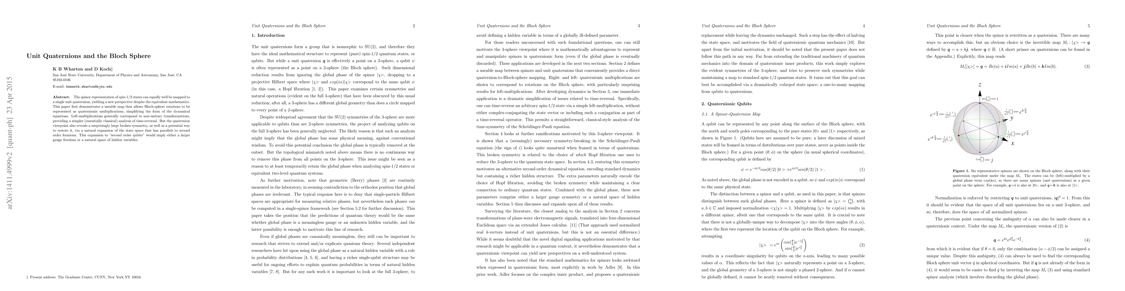 The spinor representation of spin-1/2 states can equally well be mapped to a single unit quaternion, yielding a new perspective despite the equivalent mathematics. This paper first demonstrates a useable map that allows Bloch-sphere rotations to be represented as quaternionic multiplications, simplifying the form of the dynamical equations. Left-multiplications generally correspond to non-unitary transformations, providing a simpler (essentially classical) analysis of time-reversal. But the quaternion viewpoint also reveals a surprisingly large broken symmetry, as well as a potential way to restore it, via a natural expansion of the state space that has parallels to second order fermions. This expansion to "second order qubits" would imply either a larger gauge freedom or a natural space of hidden variables.