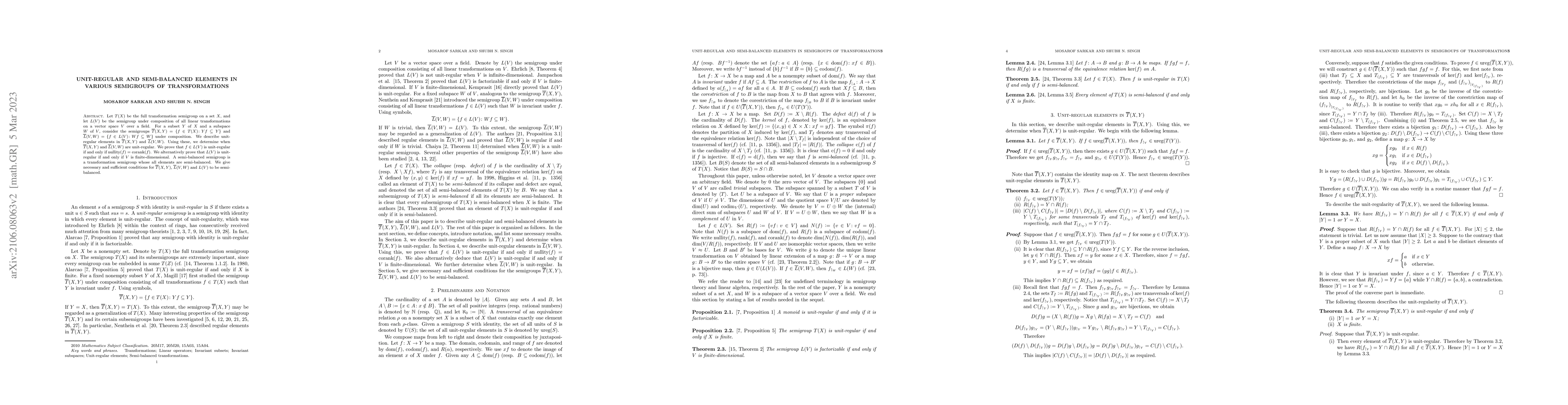 This paper investigates unit-regular and semi-balanced elements in specific semigroups of transformations, including $\overline{T}(X, Y)$ and $\overline{L}(V, W)$. It establishes conditions for these semigroups to be unit-regular and semi-balanced, proving that $L(V)$ is unit-regular if and only if $V$ is finite-dimensional.