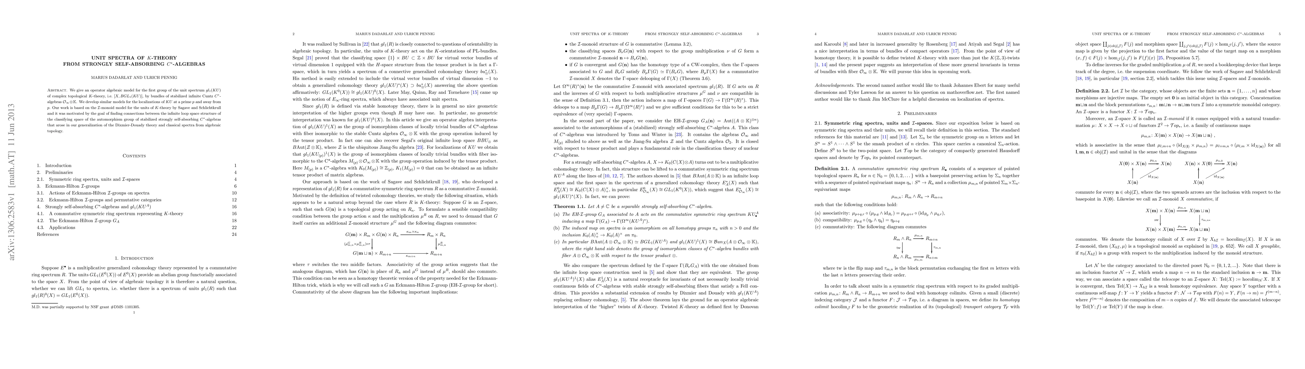We give an operator algebraic model for the first group of the unit spectrum $gl_1(KU)$ of complex topological K-theory, i.e. $[X, BGL_1(KU)]$, by bundles of stabilized infinite Cuntz C*-algebras $O_{\infty} \otimes \K$. We develop similar models for the localizations of $KU$ at a prime $p$ and away from $p$. Our work is based on the $\mathcal{I}$-monoid model for the units of $K$-theory by Sagave and Schlichtkrull and it was motivated by the goal of finding connections between the infinite loop space structure of the classifying space of the automorphism group of stabilized strongly self-absorbing C*-algebras that arose in our generalization of the Dixmier-Douady theory and classical spectra from algebraic topology.