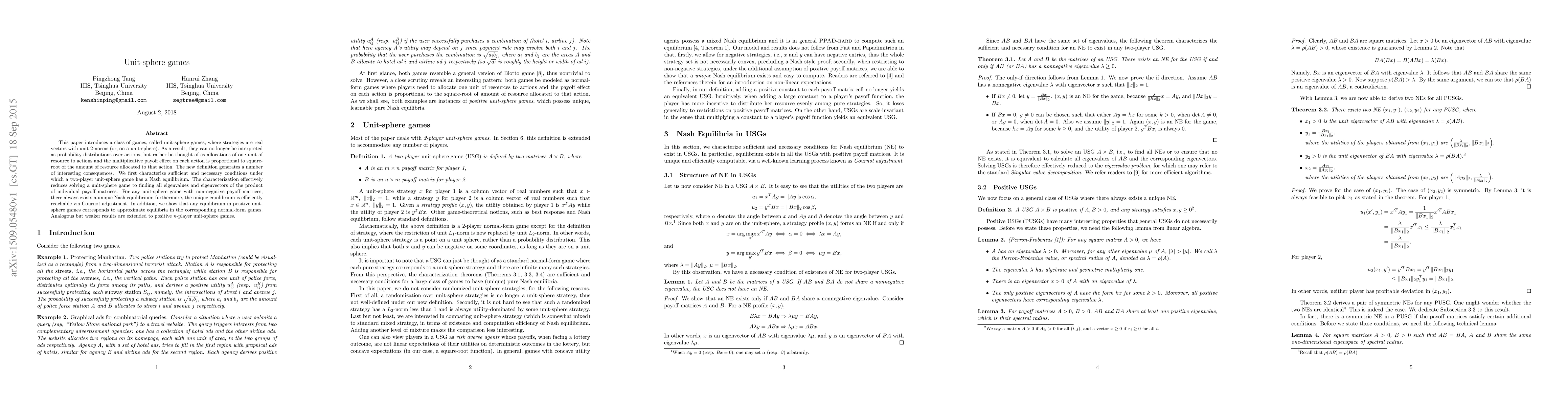 This paper defines unit-sphere games where strategies are unit-norm vectors, leading to a unique Nash equilibrium in two-player games with non-negative payoff matrices, reachable via Cournot adjustment, and corresponding equilibria in normal-form games. Similar results are extended to n-player games, albeit with weaker conditions.