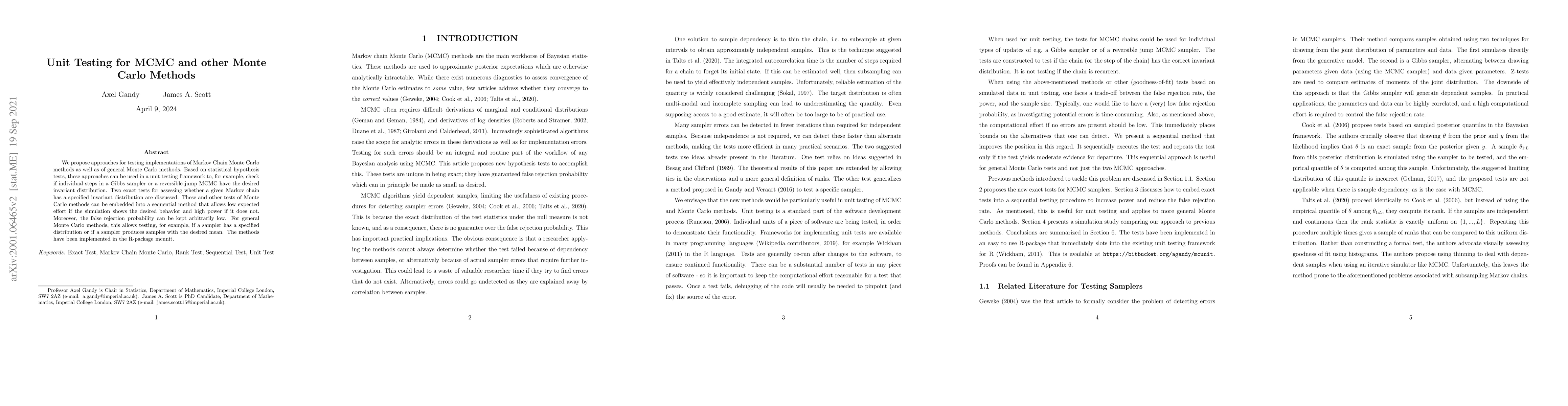 This paper proposes statistical hypothesis testing methods for unit testing implementations of MCMC and general Monte Carlo methods, ensuring they achieve the desired invariant distributions. The methods are implemented in the R-package MCUnit and can maintain low false rejection probabilities.
