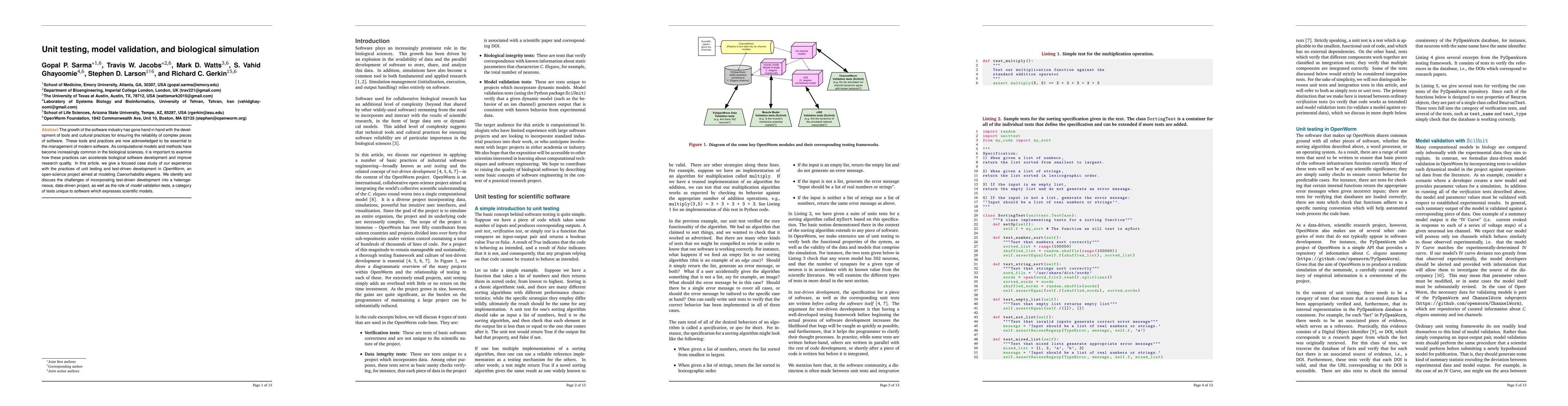 The growth of the software industry has gone hand in hand with the development of tools and cultural practices for ensuring the reliability of complex pieces of software. These tools and practices are now acknowledged to be essential to the management of modern software. As computational models and methods have become increasingly common in the biological sciences, it is important to examine how these practices can accelerate biological software development and improve research quality. In this article, we give a focused case study of our experience with the practices of unit testing and test-driven development in OpenWorm, an open-science project aimed at modeling Caenorhabditis elegans. We identify and discuss the challenges of incorporating test-driven development into a heterogeneous, data-driven project, as well as the role of model validation tests, a category of tests unique to software which expresses scientific models.