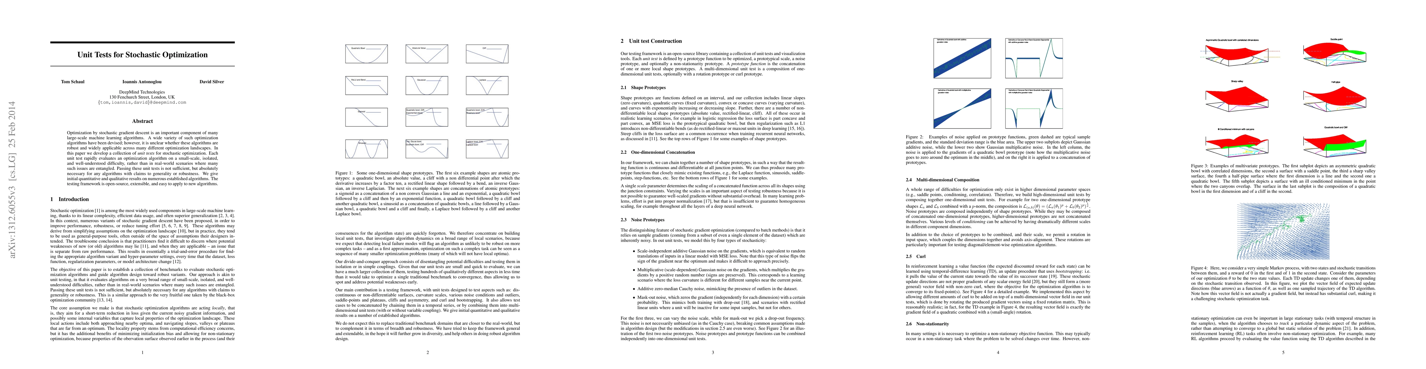 Optimization by stochastic gradient descent is an important component of many large-scale machine learning algorithms. A wide variety of such optimization algorithms have been devised; however, it is unclear whether these algorithms are robust and widely applicable across many different optimization landscapes. In this paper we develop a collection of unit tests for stochastic optimization. Each unit test rapidly evaluates an optimization algorithm on a small-scale, isolated, and well-understood difficulty, rather than in real-world scenarios where many such issues are entangled. Passing these unit tests is not sufficient, but absolutely necessary for any algorithms with claims to generality or robustness. We give initial quantitative and qualitative results on numerous established algorithms. The testing framework is open-source, extensible, and easy to apply to new algorithms.