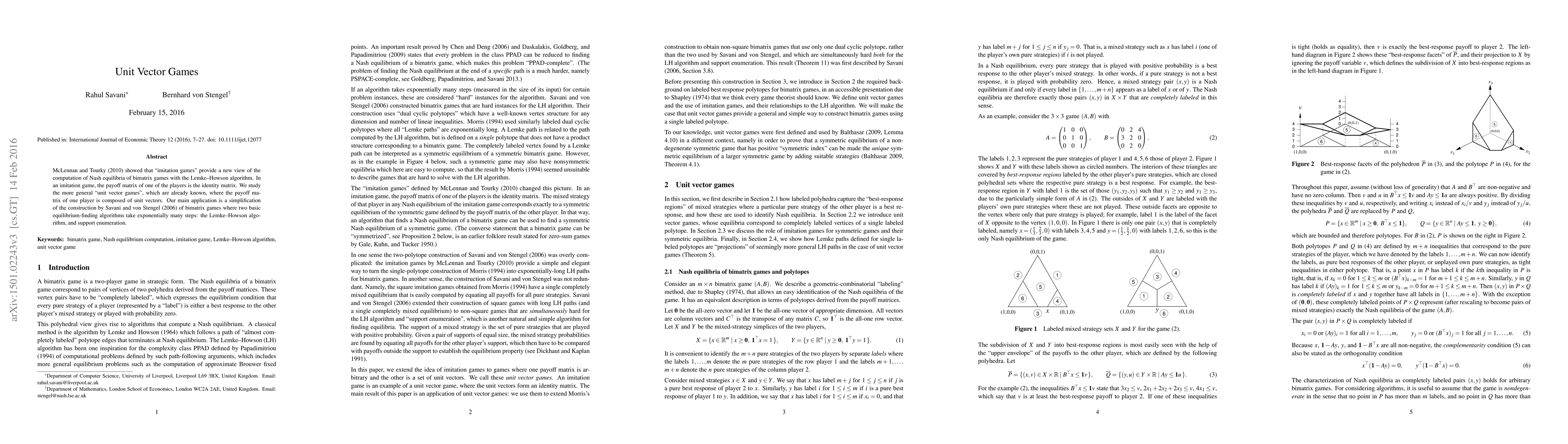 McLennan and Tourky (2010) introduced the concept of imitation games to simplify Nash equilibrium computation in bimatrix games. This summary extends to "unit vector games," where one player's payoff matrix consists of unit vectors, aiming to simplify equilibrium-finding algorithms like Lemke-Howson and support enumeration.