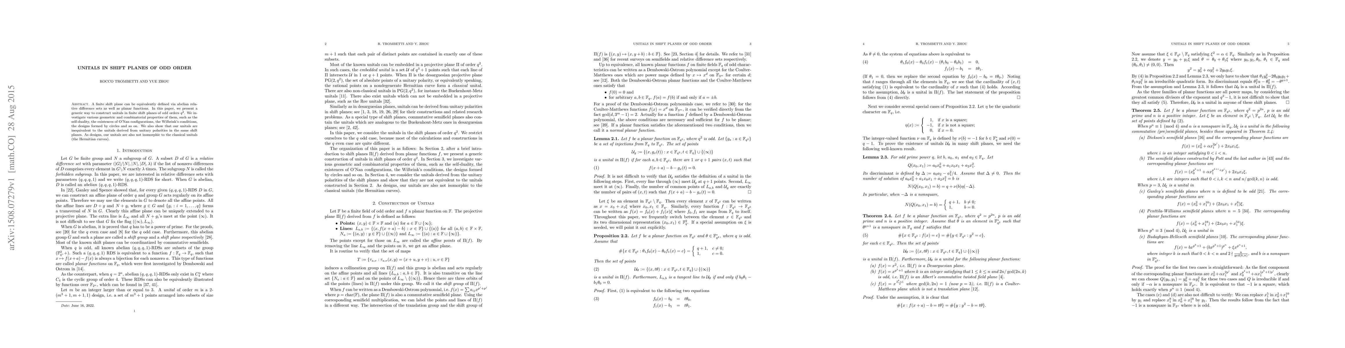 A finite shift plane can be equivalently defined via abelian relative difference sets as well as planar functions. In this paper, we present a generic way to construct unitals in finite shift planes of odd orders $q^2$. We investigate various geometric and combinatorial properties of them, such as the self-duality, the existences of O'Nan configurations, the Wilbrink's conditions, the designs formed by circles and so on. We also show that our unitals are inequivalent to the unitals derived from unitary polarities in the same shift planes. As designs, our unitals are also not isomorphic to the classical unitals (the Hermitian curves).