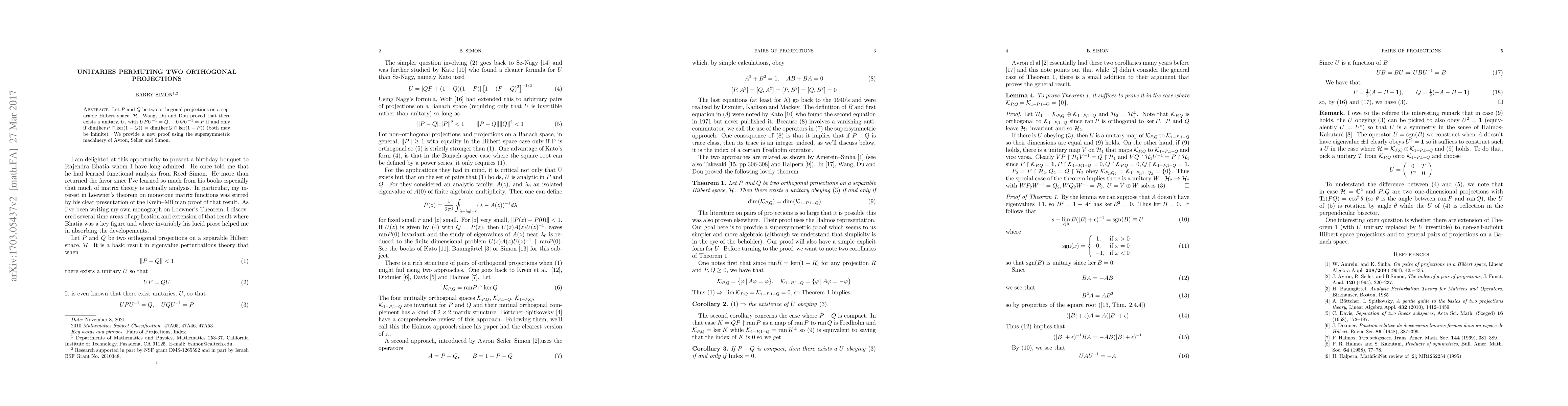 Let $P$ and $Q$ be two orthogonal projections on a separable Hilbert space, $\calH$. Wang, Du and Dou proved that there exists a unitary, $U$, with $UPU^{-1} =Q, \quad UQU^{-1} = P$ if and only if $\dim(\ker P \cap \ker(1-Q)) = \dim(\ker Q \cap \ker(1-P))$ (both may be infinite). We provide a new proof using the supersymmetric machinery of Avron, Seiler and Simon.