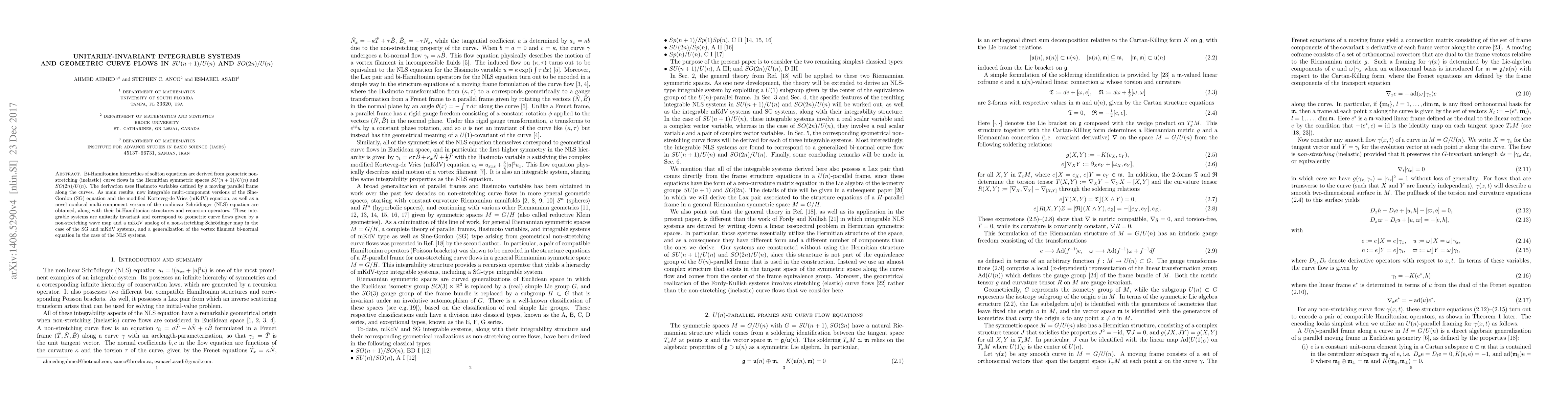 This paper derives bi-Hamiltonian hierarchies for soliton equations from geometric curve flows in $SU(n+1)/U(n)$ and $SO(2n)/U(n)$ using Hasimoto variables, leading to new integrable versions of the Sine-Gordon, modified KdV, and nonlinear Schrödinger equations. These systems exhibit unitarily invariant properties and correspond to specific geometric curve flows.