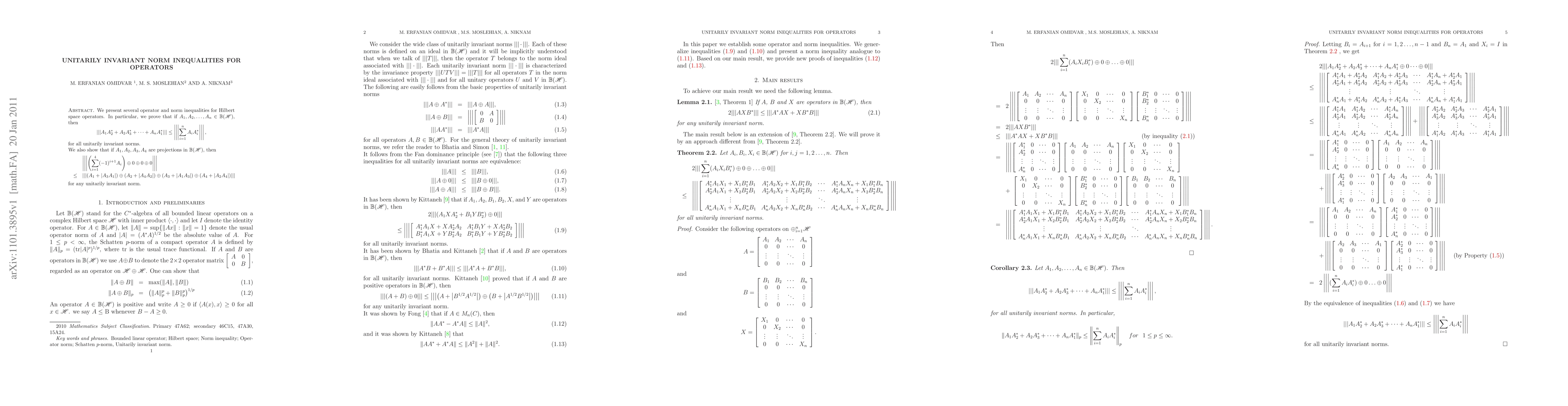 The paper establishes unitarily invariant norm inequalities for operators in Hilbert spaces, providing bounds on the norm of a sum of products of operators and their adjoints.