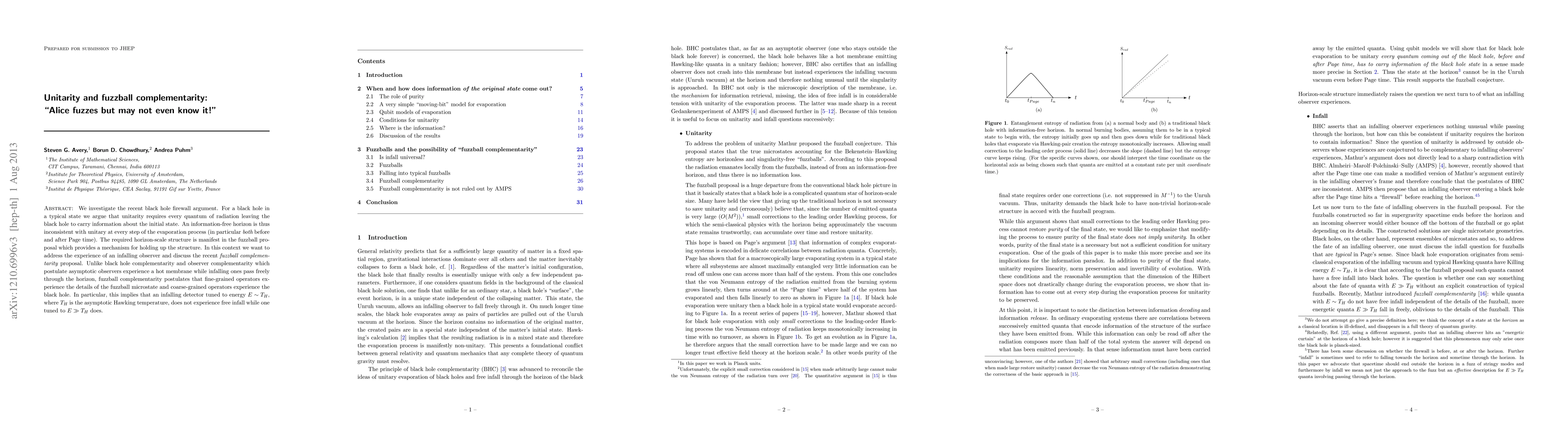 This paper argues that unitarity in black hole evaporation necessitates that every quantum of radiation retains information about the initial state, invalidating an information-free horizon. It supports the fuzzball proposal as a mechanism that maintains horizon-scale structure, and discusses the fuzzball complementarity, which posits that different observers experience different details of the black hole microstate.