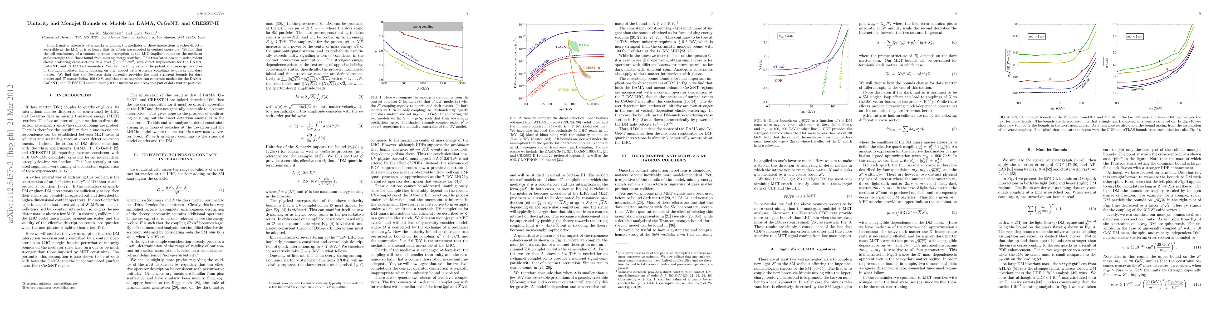 This paper investigates the implications of dark matter interactions with quarks or gluons, showing that LHC monojet searches provide stronger constraints on mediator scales than missing energy searches. It concludes that these constraints limit the spin-independent elastic scattering cross-section, impacting the DAMA, CoGeNT, and CRESST-II anomalies, and that the Tevatron data offers the most stringent limits for low dark matter and Z' masses.
