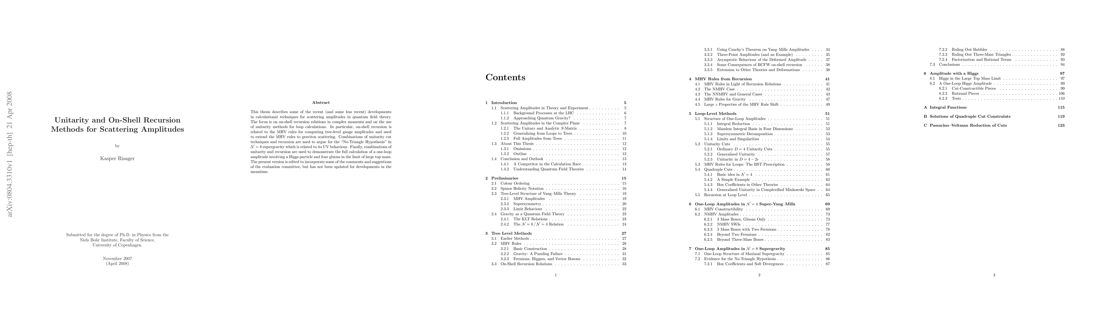 This thesis explores advanced calculational techniques for scattering amplitudes in quantum field theory, focusing on on-shell recursion methods and unitarity techniques for loop calculations. It extends MHV rules to graviton scattering and uses unitarity and recursion to support the "No-Triangle Hypothesis" in N=8 supergravity and calculate a one-loop amplitude involving a Higgs and four gluons.