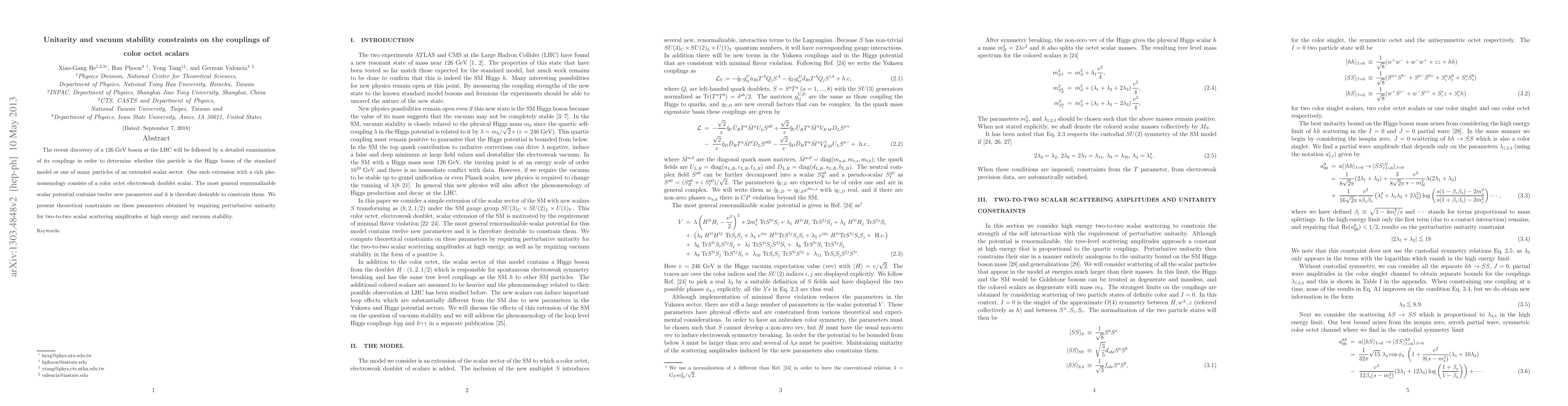 This paper explores theoretical constraints on the couplings of color octet scalars, focusing on unitarity and vacuum stability. The study aims to determine the implications of these constraints for the extended scalar sector beyond the standard model, following the discovery of a 126 GeV boson at the LHC.