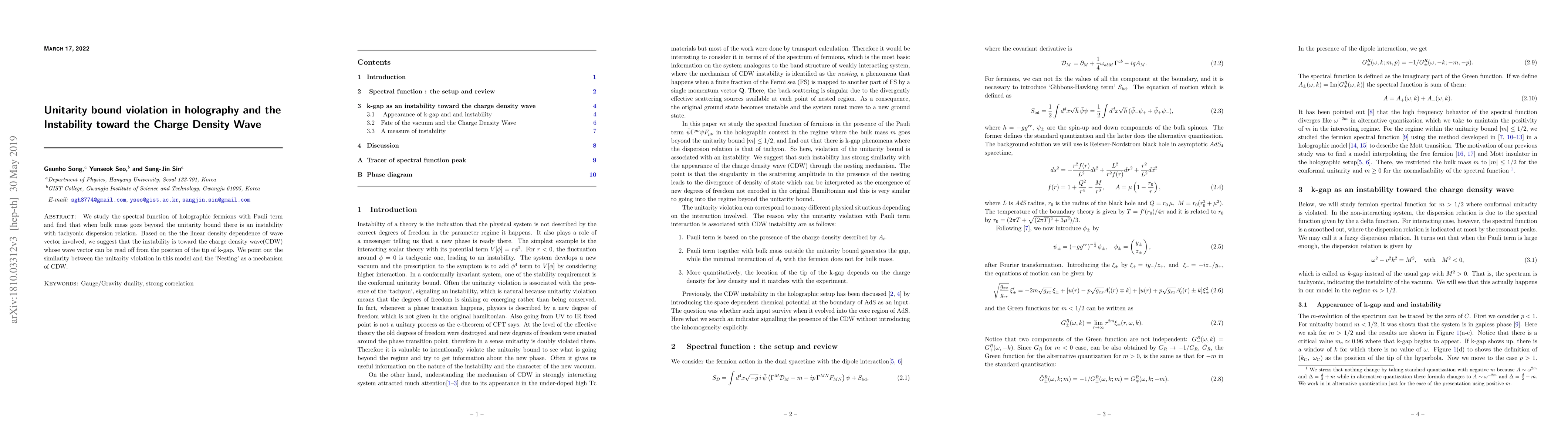 We study the spectral function of fermions in a holographic set up with bulk Dirac mass in the regime beyond the conformal unitarity bound, and find that spectral function has the dispersion relation with tachyonic behavior, indicating an instability. Based on linearity between the density and the position of the tip of the k-gap, we suggest that this instability is toward the charge density wave(CDW) and the position of the tip can be identified as the wave vector of CDW. For the physical origin, we point out the similarity of unitarity violation in our non-Fermi Liquid theory and nesting phenomena in the Fermi liquid theory as the mechanism of CDW instability.
