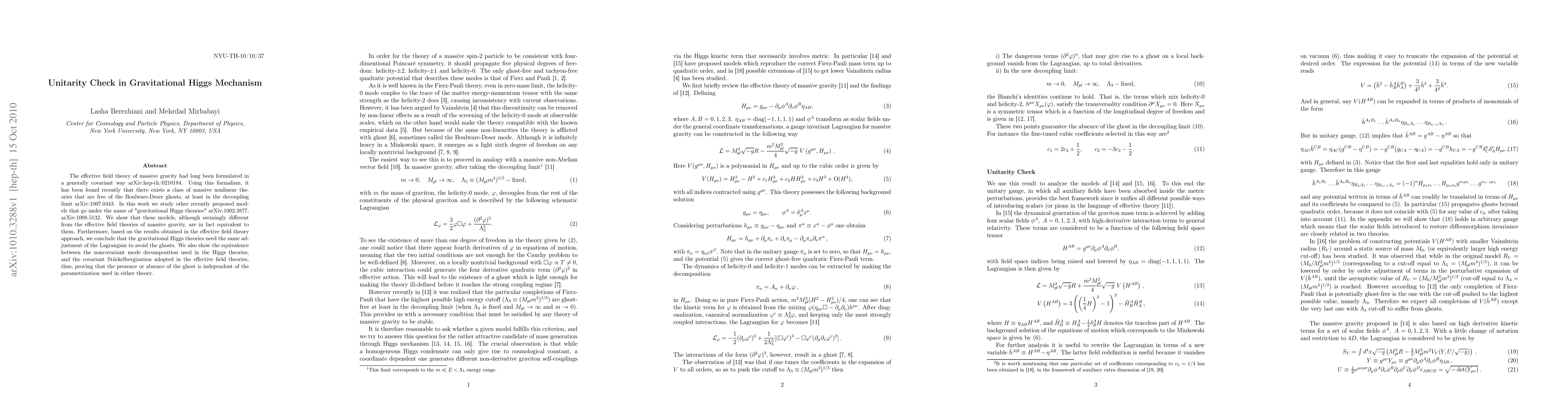 The effective field theory of massive gravity had long been formulated in a generally covariant way arXiv:hep-th/0210184. Using this formalism, it has been found recently that there exists a class of massive nonlinear theories that are free of the Boulware-Deser ghosts, at least in the decoupling limit arXiv:1007.0443. In this work we study other recently proposed models that go under the name of "gravitational Higgs theories" arXiv:1002.3877, arXiv:1008.5132. We show that these models, although seemingly different from the effective field theories of massive gravity, are in fact equivalent to them. Furthermore, based on the results obtained in the effective field theory approach, we conclude that the gravitational Higgs theories need the same adjustment of the Lagrangian to avoid the ghosts. We also show the equivalence between the noncovariant mode decomposition used in the Higgs theories, and the covariant St\"uckelbergization adopted in the effective field theories, thus, proving that the presence or absence of the ghost is independent of the parametrization used in either theory.