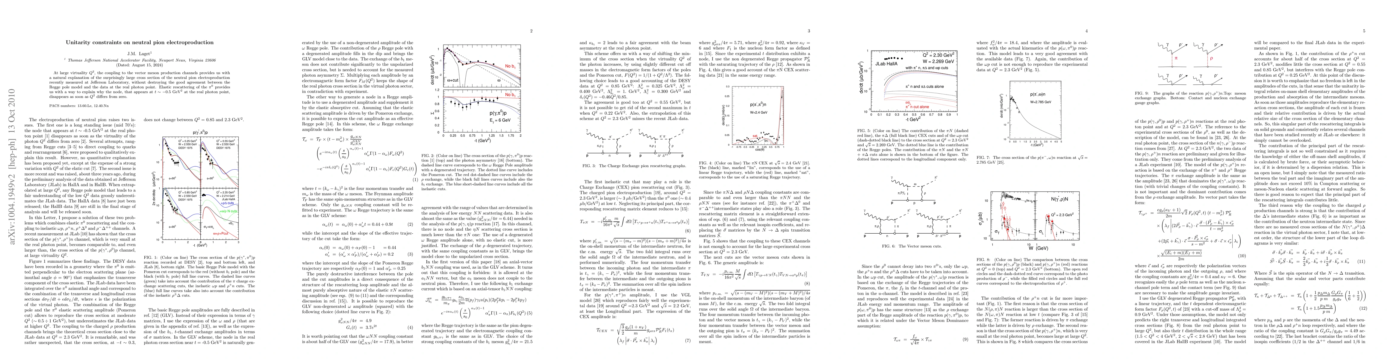 At large virtuality $Q^2$, the coupling to the vector meson production channels provides us with a natural explanation of the surprisingly large cross section of the neutral pion electroproduction recently measured at Jefferson Laboratory, without destroying the good agreement between the Regge pole model and the data at the real photon point. Elastic rescattering of the $\pi^0$ provides us with a way to explain why the node, that appears at $t\sim -0.5$ GeV$^2$ at the real photon point, disappears as soon as $Q^2$ differs from zero.