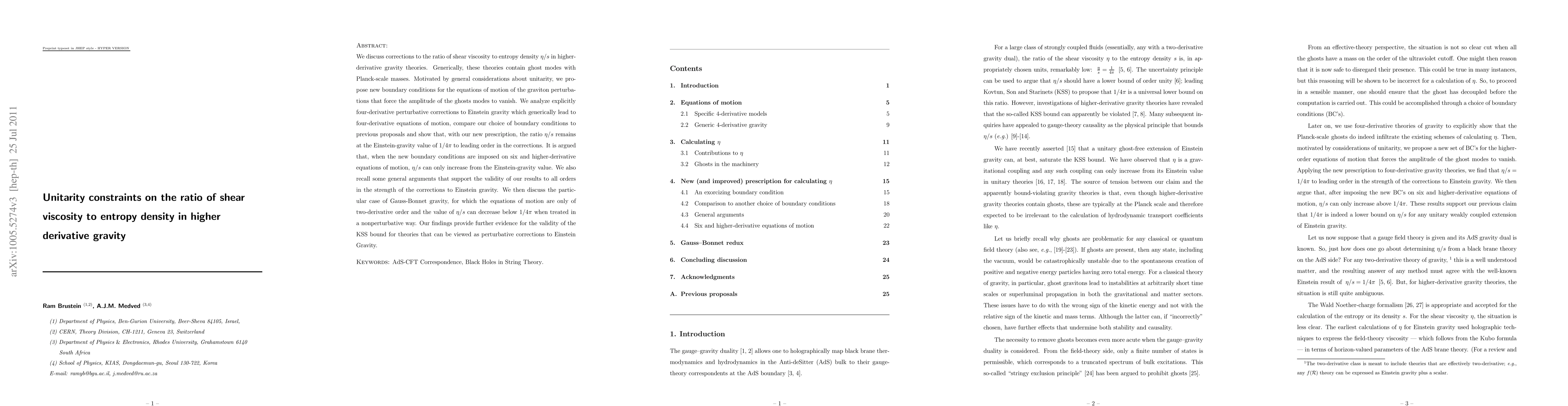 This paper investigates the ratio of shear viscosity to entropy density $\eta/s$ in higher-derivative gravity theories, proposing new boundary conditions to maintain unitarity and show that $\eta/s$ remains at $1/4\pi$ to leading order in corrections. It also discusses the implications for Gauss-Bonnet gravity, where nonperturbative treatments can lower $\eta/s$ below $1/4\pi$.