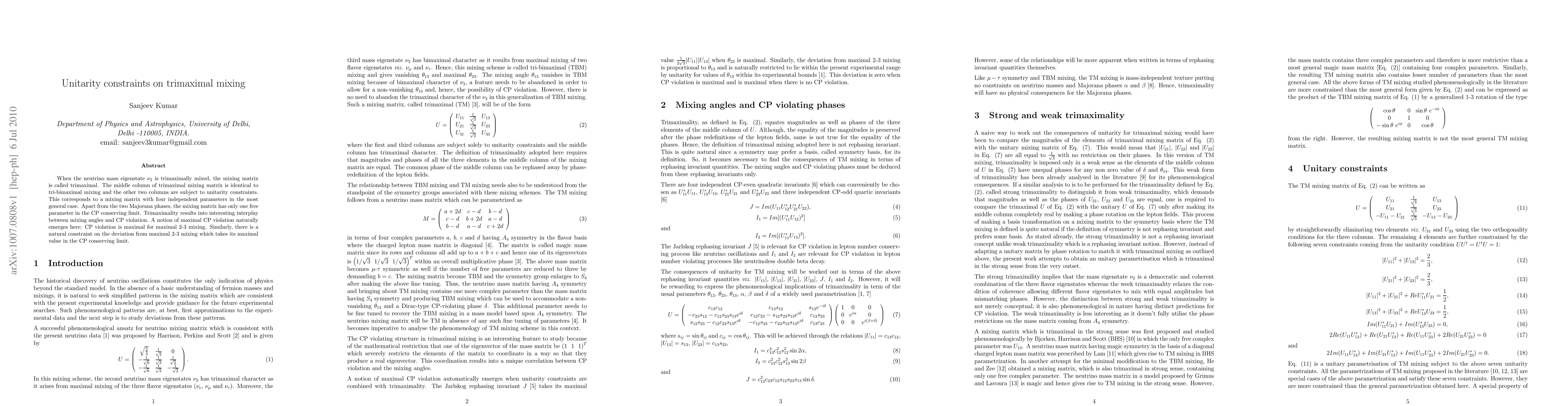 This paper explores the unitarity constraints on trimaximal mixing in neutrino oscillations, where the mixing matrix has four independent parameters. It reveals an interesting interplay between mixing angles and CP violation, highlighting maximal CP violation for maximal 2-3 mixing and the constraints on deviations from this maximal mixing in the CP conserving limit.