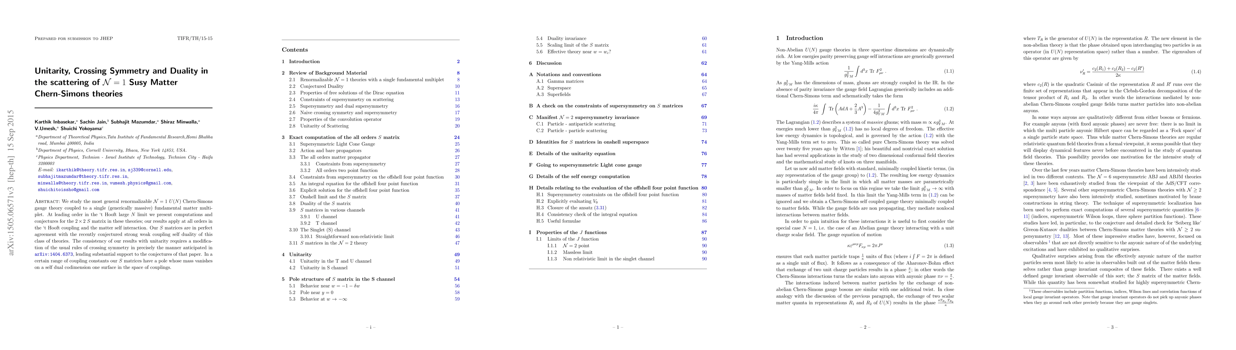 We study the most general renormalizable ${\cal N}=1$ $U(N)$ Chern-Simons gauge theory coupled to a single (generically massive) fundamental matter multiplet. At leading order in the 't Hooft large $N$ limit we present computations and conjectures for the $2 \times 2$ $S$ matrix in these theories; our results apply at all orders in the 't Hooft coupling and the matter self interaction. Our $S$ matrices are in perfect agreement with the recently conjectured strong weak coupling self duality of this class of theories. The consistency of our results with unitarity requires a modification of the usual rules of crossing symmetry in precisely the manner anticipated in arXiv:1404.6373, lending substantial support to the conjectures of that paper. In a certain range of coupling constants our $S$ matrices have a pole whose mass vanishes on a self dual codimension one surface in the space of couplings.