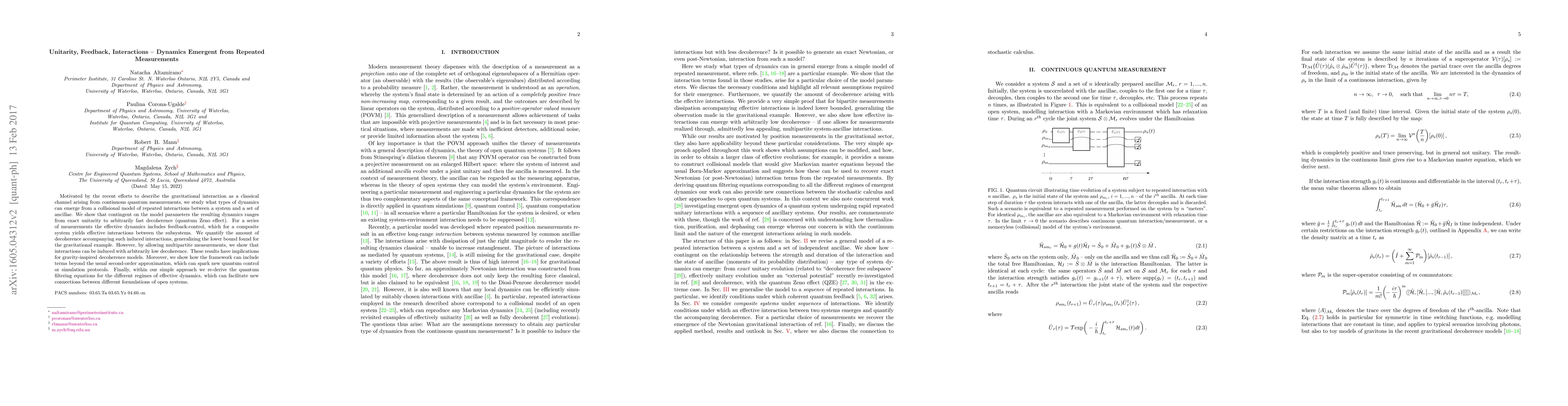 Motivated by the recent efforts to describe the gravitational interaction as a classical channel arising from continuous quantum measurements, we study what types of dynamics can emerge from a collisional model of repeated interactions between a system and a set of ancillae. We show that contingent on the model parameters the resulting dynamics ranges from exact unitarity to arbitrarily fast decoherence (quantum Zeno effect). For a series of measurements the effective dynamics includes feedback-control, which for a composite system yields effective interactions between the subsystems. We quantify the amount of decoherence accompanying such induced interactions, generalizing the lower bound found for the gravitational example. However, by allowing multipartite measurements, we show that interactions can be induced with arbitrarily low decoherence. These results have implications for gravity-inspired decoherence models. Moreover, we show how the framework can include terms beyond the usual second-order approximation, which can spark new quantum control or simulation protocols. Finally, within our simple approach we re-derive the quantum filtering equations for the different regimes of effective dynamics, which can facilitate new connections between different formulations of open systems.