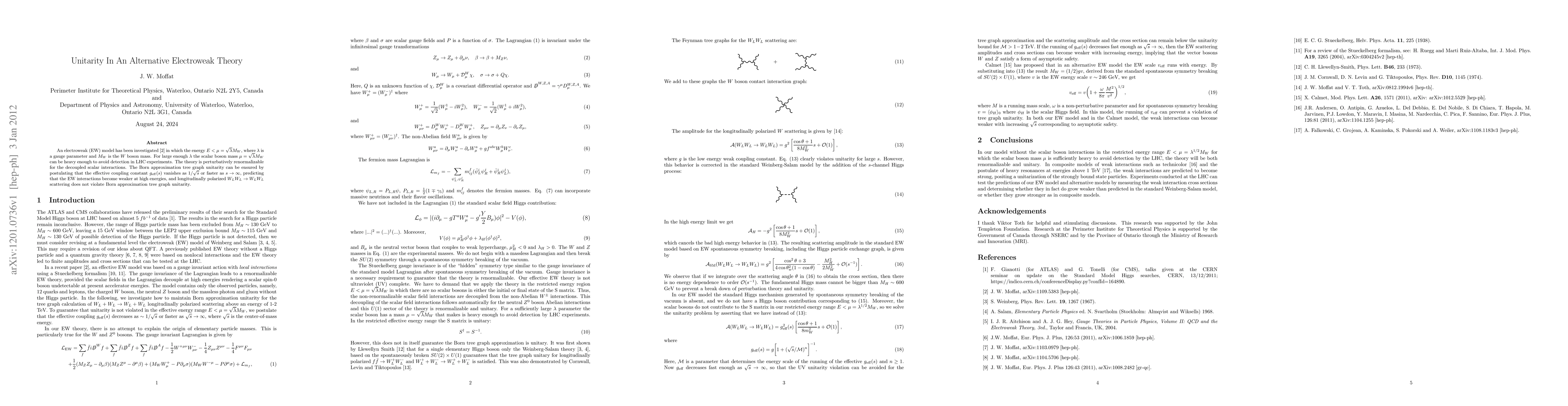 An electroweak (EW) model has been investigated (Moffat) in which the energy $E < \mu=\sqrt{\lambda}M_W$, where $\lambda$ is a gauge parameter and $M_W$ is the $W$ boson mass. For large enough $\lambda$ the scalar boson mass $\mu=\sqrt{\lambda}M_W$ can be heavy enough to avoid detection in LHC experiments. The theory is perturbatively renormalizable for the decoupled scalar interactions. The Born approximation tree graph unitarity can be ensured by postulating that the effective coupling constant $g_{\rm eff}(s)$ vanishes as $1/\sqrt{s}$ or faster as $s\rightarrow\infty$, predicting that the EW interactions become weaker at high energies, and longitudinally polarized $W_L W_L\rightarrow W_L W_L$ scattering does not violate Born approximation tree graph unitarity.