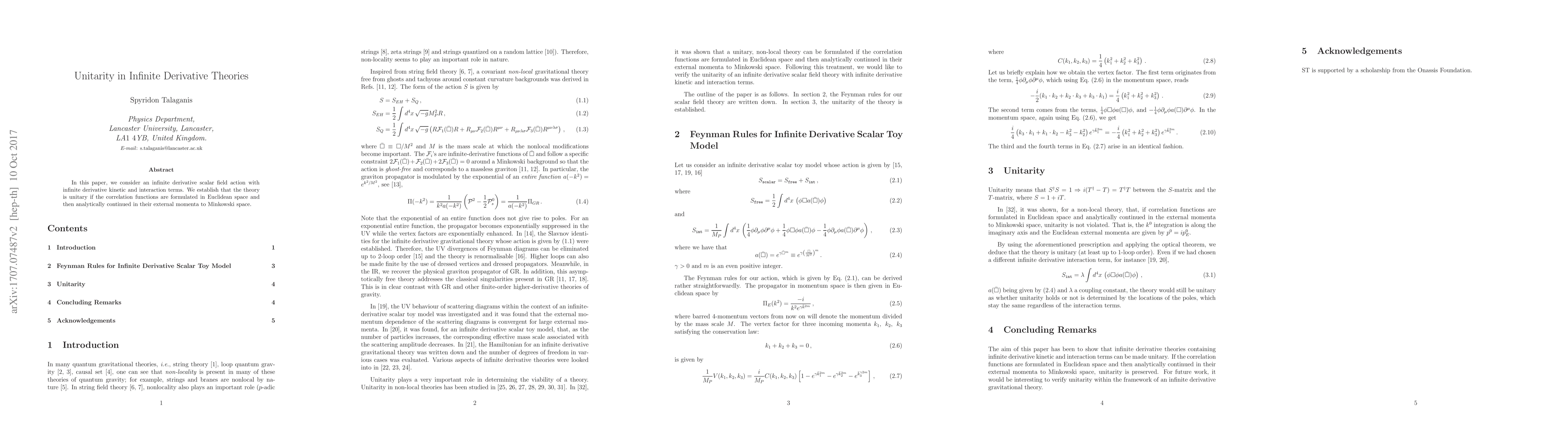 This paper investigates a scalar field action with infinite derivatives in infinite derivative theories, finding that it is unitary when using Euclidean space correlation functions continued to Minkowski space.