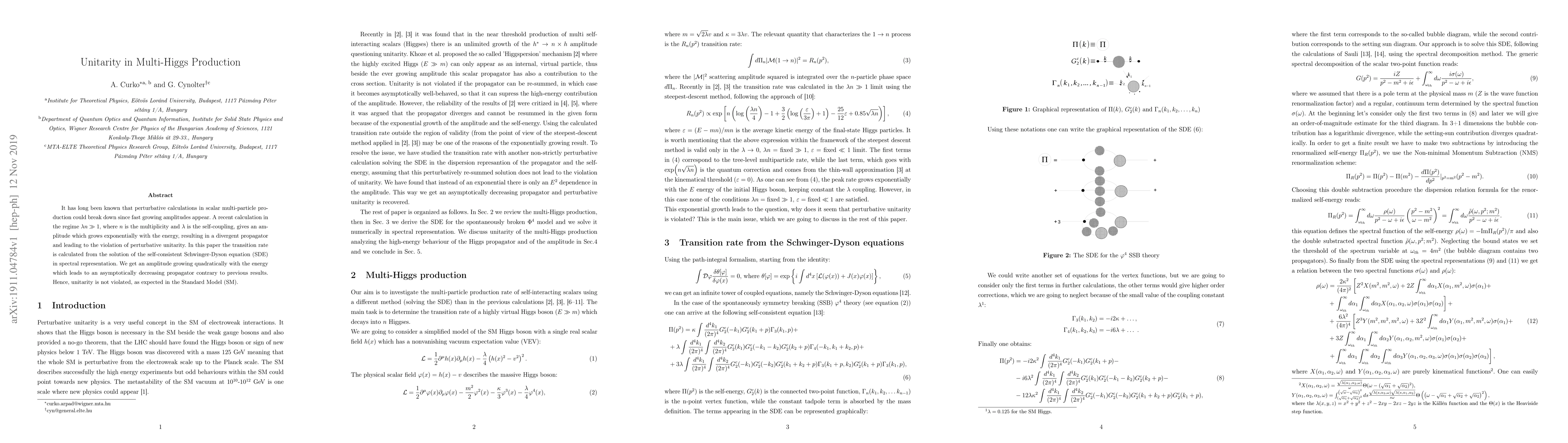 It has long been known that perturbative calculations in scalar multi-particle production could break down since fast growing amplitudes appear. A recent calculation in the regime $ \lambda n \gg 1$, where $ n $ is the multiplicity and $ \lambda $ is the self-coupling, gives an amplitude which grows exponentially with the energy, resulting in a divergent propagator and leading to the violation of perturbative unitarity. In this paper the transition rate is calculated from the solution of the self-consistent Schwinger-Dyson equation in spectral representation. We get an amplitude growing quadratically with the energy which leads to an asymptotically decreasing propagator contrary to previous results. Hence, unitarity is not violated, as expected in the Standard Model.