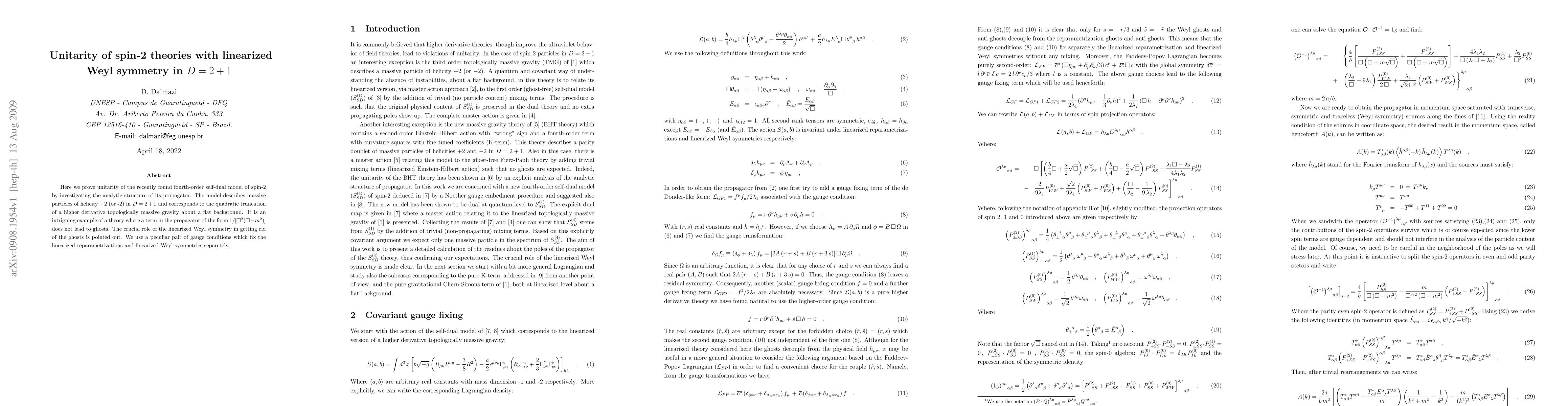 Here we prove unitarity of the recently found fourth-order self-dual model of spin-2 by investigating the analytic structure of its propagator. The model describes massive particles of helicity +2 (or -2) in $D=2+1$ and corresponds to the quadratic truncation of a higher derivative topologically massive gravity about a flat background. It is an intriguing example of a theory where a term in the propagator of the form $1/\lbrack\Box^2 (\Box - m^2)\rbrack $ does not lead to ghosts. The crucial role of the linearized Weyl symmetry in getting rid of the ghosts is pointed out. We use a peculiar pair of gauge conditions which fix the linearized reparametrizations and linearized Weyl symmetries separetely.