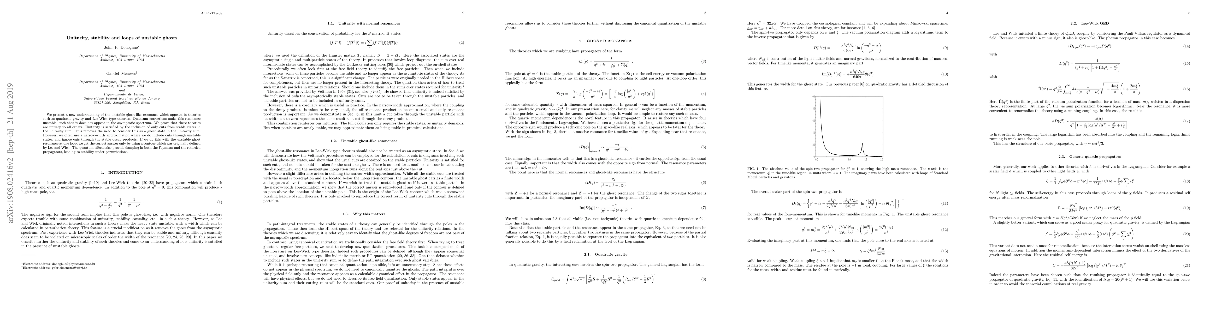 The paper presents a novel perspective on unstable ghost-like resonances in theories like quadratic gravity and Lee-Wick models, proving their unitarity at all orders. Quantum corrections render these resonances unstable, eliminating them from the asymptotic spectrum. Unitarity is maintained by considering only cuts from stable states, avoiding treatment as a ghost in the unitarity sum. Despite this, narrow-width approximation requires inclusion of cuts through unstable states, yielding accurate results only with Lee and Wick's original contour. Quantum effects also induce damping in Feynman and retarded propagators, ensuring stability under perturbations.