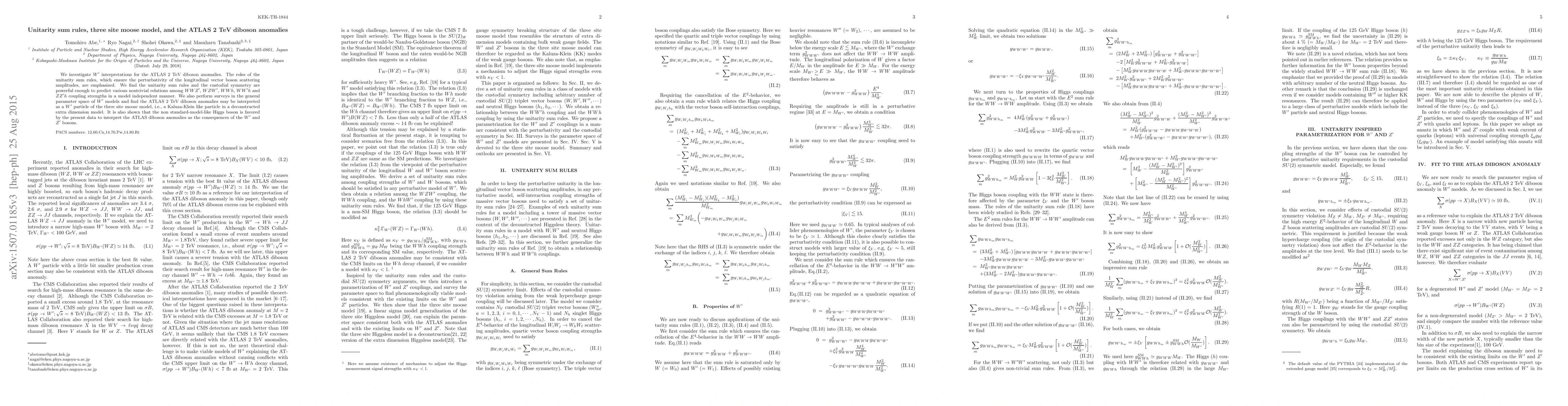 We investigate $W'$ interpretations for the ATLAS 2 TeV diboson anomalies. The roles of the unitarity sum rules, which ensure the perturbativity of the longitudinal vector boson scattering amplitudes, are emphasized. We find the unitarity sum rules and the custodial symmetry are powerful enough to predict various nontrivial relations among $WWZ'$, $WZW'$, $WWh$, $WW'h$ and $ZZ'h$ coupling strengths in a model independent manner. We also perform surveys in the general parameter space of $W'$ models and find the ATLAS 2 TeV diboson anomalies may be interpreted as a $W'$ particle of the three site moose model, i.e., a Kaluza-Klein like particle in a deconstructed extra dimension model. It is also shown that the non standard-model-like Higgs boson is favored by the present data to interpret the ATLAS diboson anomalies as the consequences of the $W'$ and $Z'$ bosons.