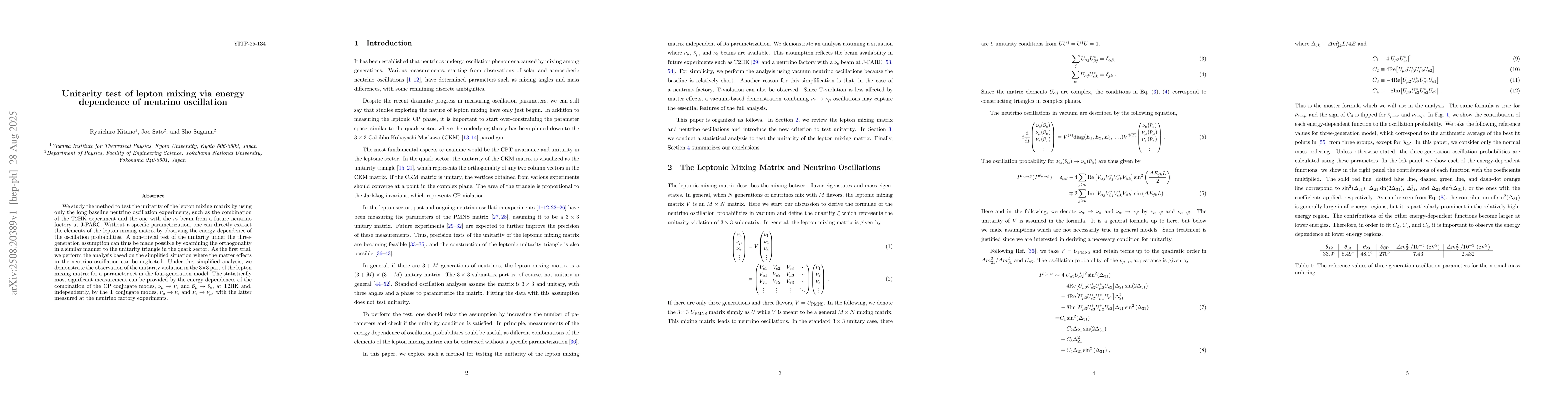 We study the method to test the unitarity of the lepton mixing matrix by using only the long baseline neutrino oscillation experiments, such as the combination of the T2HK experiment and the one with the $\nu_e$ beam from a future neutrino factory at J-PARC. Without a specific parametrization, one can directly extract the elements of the lepton mixing matrix by observing the energy dependence of the oscillation probabilities. A non-trivial test of the unitarity under the three-generation assumption can thus be made possible by examining the orthogonality in a similar manner to the unitarity triangle in the quark sector. As the first trial, we perform the analysis based on the simplified situation where the matter effects in the neutrino oscillation can be neglected. Under this simplified analysis, we demonstrate the observation of the unitarity violation in the $3\times3$ part of the lepton mixing matrix for a parameter set in the four-generation model. The statistically most significant measurement can be provided by the energy dependences of the combination of the CP conjugate modes, $\nu_\mu \to \nu_e$ and $\bar \nu_\mu \to \bar \nu_e$, at T2HK and, independently, by the T conjugate modes, $\nu_\mu \to \nu_e$ and $\nu_e \to \nu_\mu$, with the latter measured at the neutrino factory experiments.