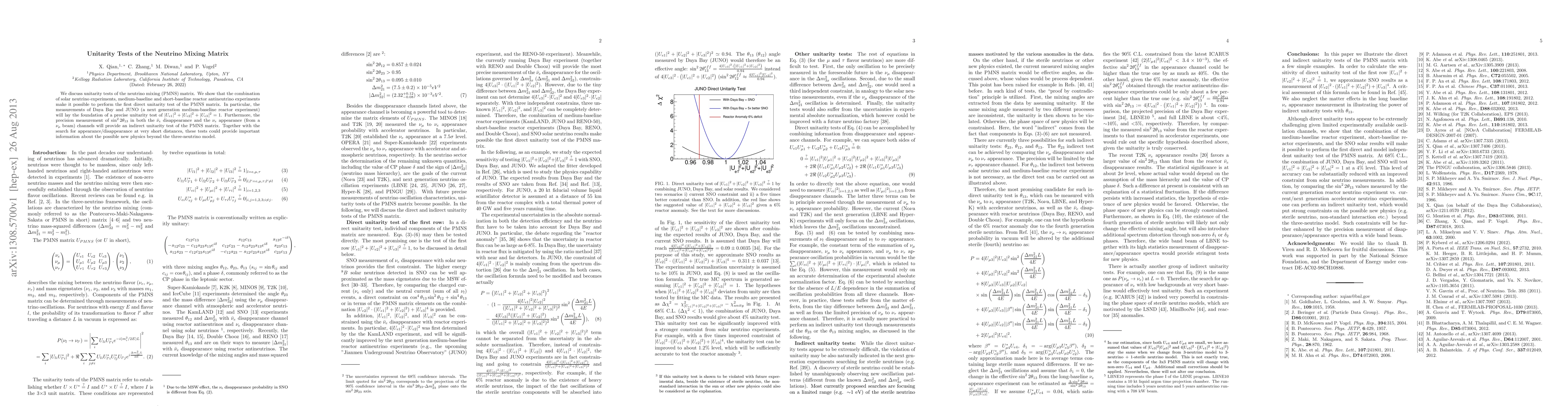 This paper discusses unitarity tests of the neutrino mixing matrix (PMNS) using data from solar neutrino experiments and reactor antineutrino experiments like Daya Bay and JUNO. It highlights the potential of these experiments to directly test the unitarity condition and provide insights into possible new physics beyond the standard three-neutrino model.