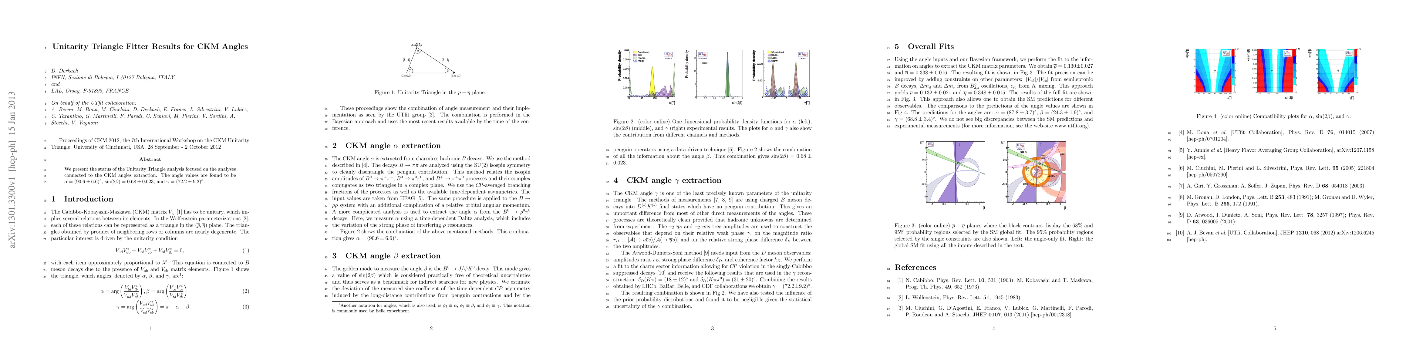 This paper reports the latest findings from Unitarity Triangle analysis, determining the CKM angles as $\alpha = (90.6\pm 6.6)^{\circ}$, $\sin(2\beta) = 0.68\pm 0.023$, and $\gamma=(72.2\pm 9.2)^{\circ}$. These results contribute to the understanding of the weak interaction in particle physics.