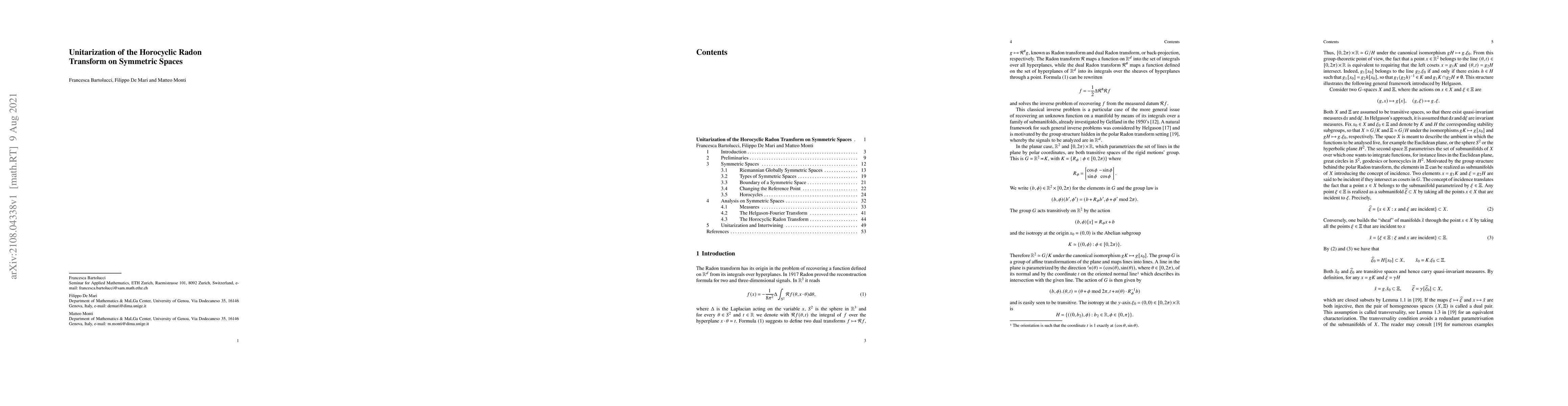 This paper addresses the unitarization of the horocyclic Radon transform on noncompact symmetric spaces, constructing a pseudo-differential operator that extends the Radon transform to a unitary operator between $L^2$ spaces, accounting for Weyl symmetries and intertwining the quasi-regular representations of the associated group.