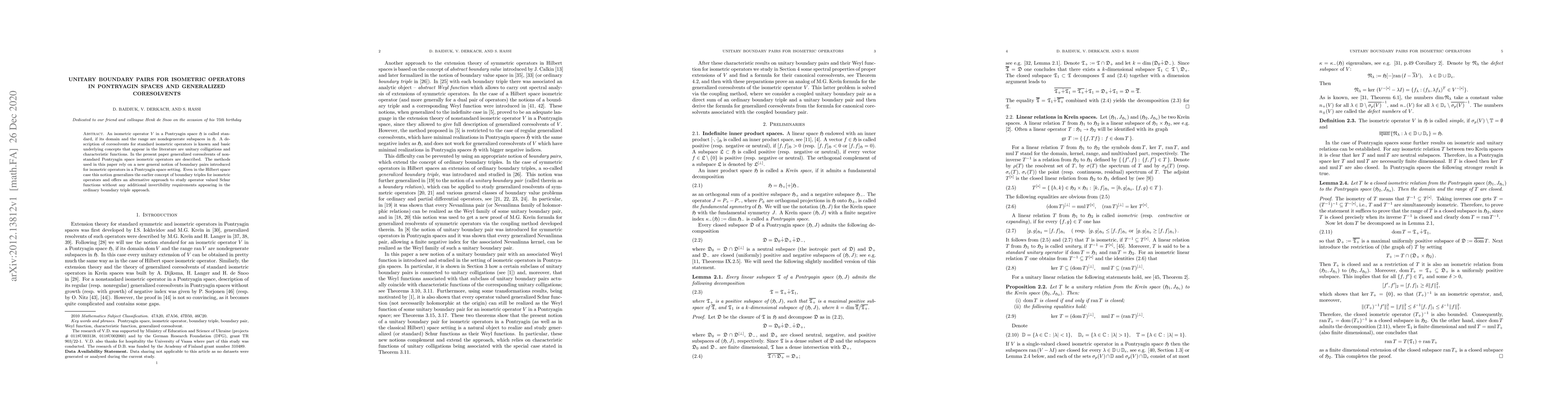 This paper introduces a new concept of unitary boundary pairs for isometric operators in Pontryagin spaces, extending the notion of boundary triples in Hilbert spaces. It describes generalized coresolvents for non-standard isometric operators, offering an alternative approach to study operator-valued Schur functions without additional invertibility requirements.