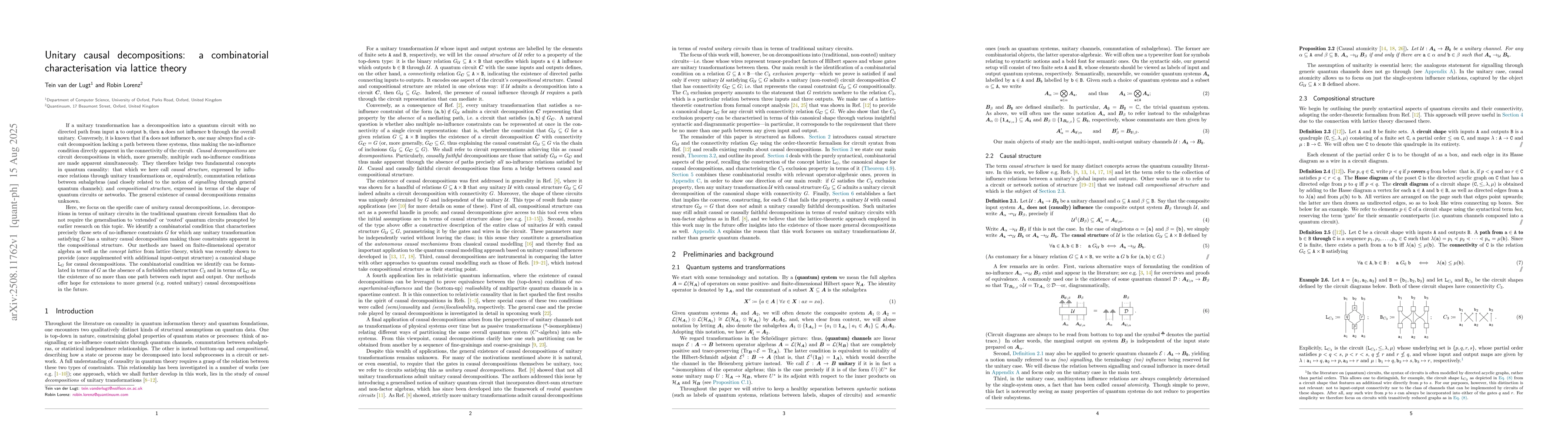 If a unitary transformation has a decomposition into a quantum circuit with no directed path from input $a$ to output $b$, then $a$ does not influence $b$ through the overall unitary. Conversely, it is known that if $a$ does not influence $b$, one may always find a circuit decomposition lacking a path between these systems, thus making the no-influence condition directly apparent in the connectivity of the circuit. Causal decompositions are circuit decompositions in which, more generally, multiple such no-influence conditions are made apparent simultaneously. They bridge two fundamental concepts in quantum causality: causal structure, as expressed by influences through unitary transformations (and related to signalling through quantum channels); and compositional structure, expressed in terms of the shape of quantum circuits or networks. The general existence of causal decompositions remains unknown. This work focusses on unitary causal decompositions, i.e. decompositions in terms of unitary circuits in the traditional quantum circuit formalism that do not require the generalisation to `extended' or `routed' quantum circuits prompted by earlier research on this topic. We identify a combinatorial condition that characterises precisely those sets of causal no-influence constraints $G$ for which any unitary transformation satisfying $G$ has a unitary causal decomposition compositionally representing those constraints. Our methods are based on finite-dimensional operator algebra as well as the concept lattice construction, which was recently shown to provide a canonical shape $L_G$ for causal decompositions. The combinatorial condition we identify can be formulated in terms of $G$ as the absence of a forbidden substructure $C_3$ and in terms of $L_G$ as the existence of no more than one path between each input and output.