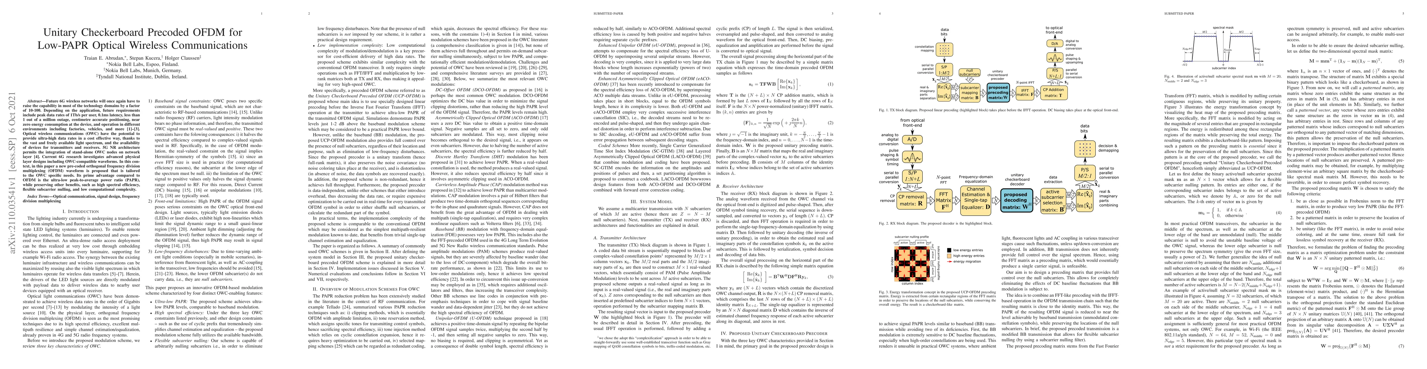 This paper proposes a unitary checkerboard precoded OFDM waveform for optical wireless communications in 6G networks, aiming to achieve ultra-low peak-to-average power ratio (PAPR) while maintaining high spectral efficiency, flexible subcarrier nulling, and low computational complexity. This approach enhances the feasibility of cost-effective, ultra-high data rate communications in diverse environments.