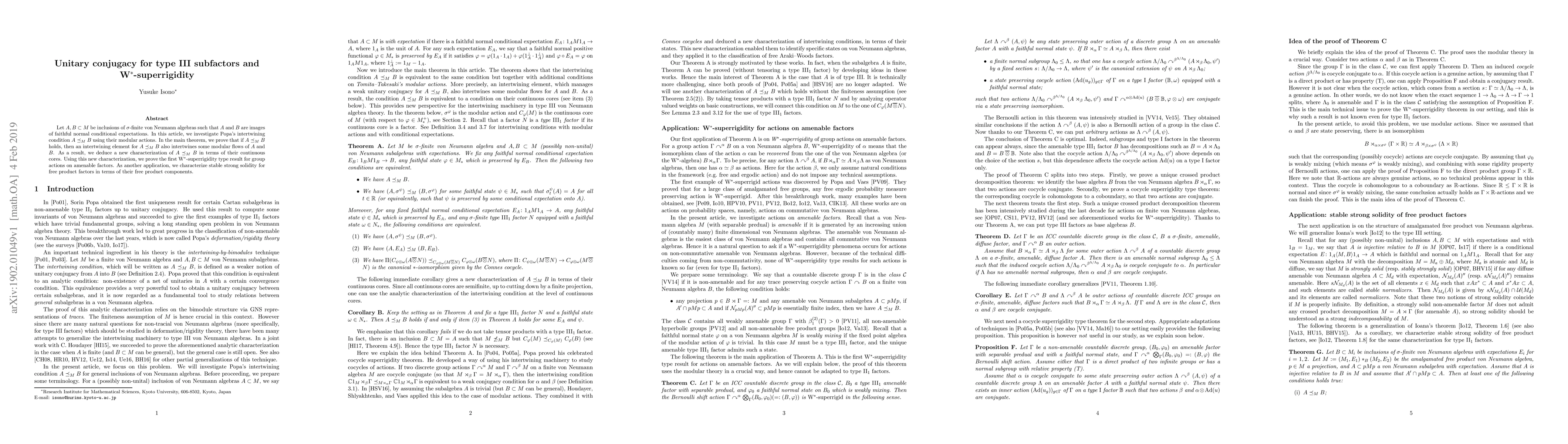 Let $A,B\subset M$ be inclusions of $\sigma$-finite von Neumann algebras such that $A$ and $B$ are images of faithful normal conditional expectations. In this article, we investigate Popa's intertwining condition $A\preceq_MB$ using their modular actions. In the main theorem, we prove that if $A\preceq_MB$ holds, then an intertwining element for $A\preceq_MB$ also intertwines some modular flows of $A$ and $B$. As a result, we deduce a new characterization of $A\preceq_MB$ in terms of their continuous cores. Using this new characterization, we prove the first W$^*$-superrigidity type result for group actions on amenable factors. As another application, we characterize stable strong solidity for free product factors in terms of their free product components.