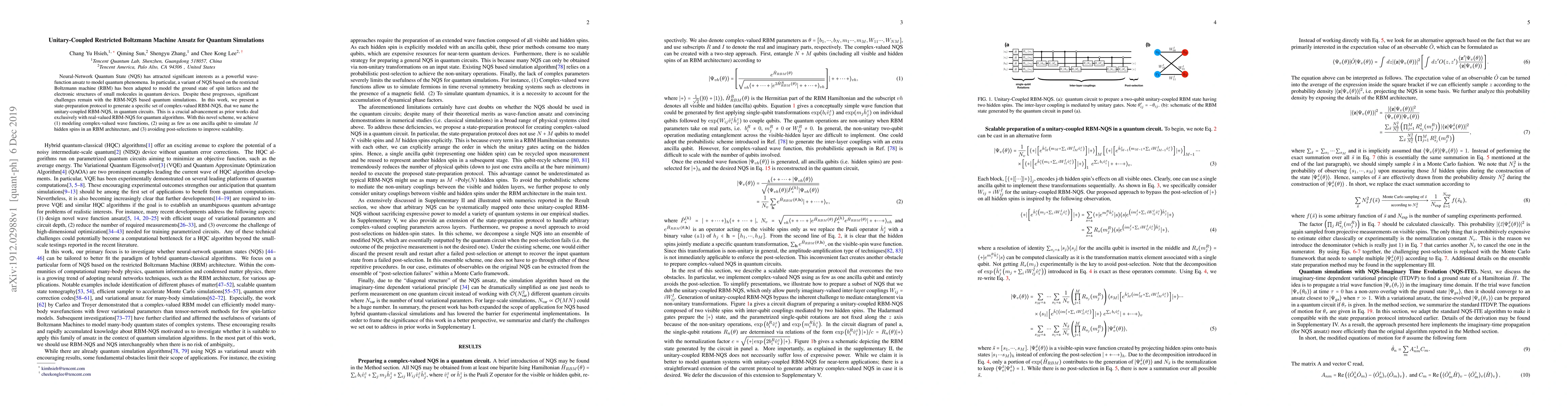 This paper introduces a novel unitary-coupled restricted Boltzmann machine (RBM) ansatz for quantum simulations, enabling complex-valued wave function modeling and significantly improving scalability by using minimal ancilla qubits and avoiding post-selections.