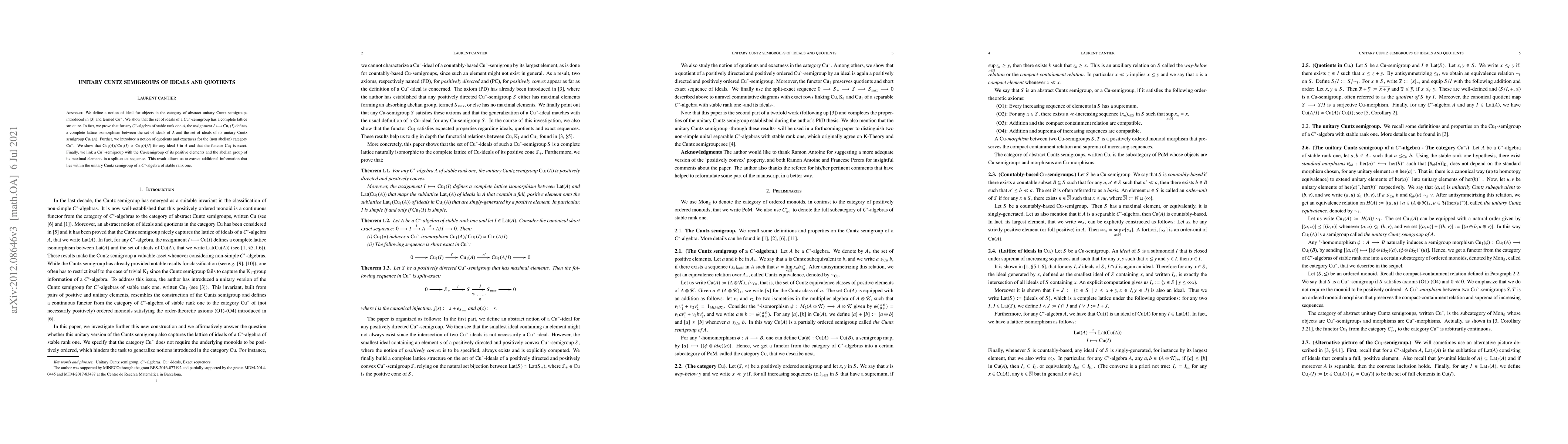 This paper introduces ideals and quotients in the category of abstract unitary Cuntz semigroups (Cu$^\sim$) and shows that the set of ideals of a Cu$^\sim$-semigroup forms a complete lattice. It establishes a complete lattice isomorphism between the ideals of a C$^*$-algebra of stable rank one and its unitary Cuntz semigroup, and proves that the functor Cu$_1$ is exact.