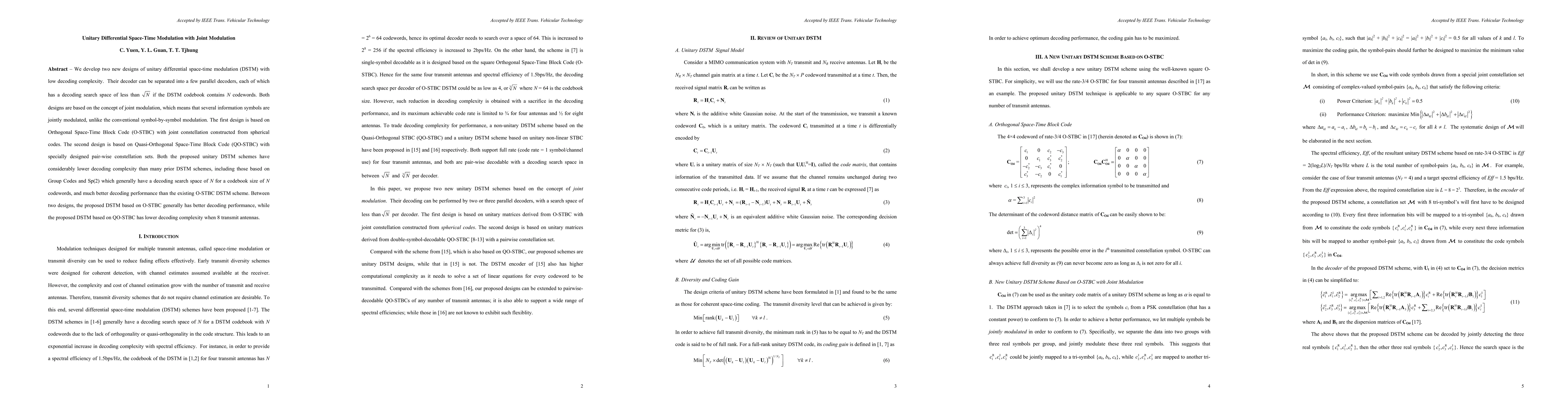 This paper proposes two low-complexity unitary differential space-time modulation designs based on joint modulation, significantly reducing decoding complexity compared to prior methods. The first design uses Orthogonal Space-Time Block Codes with spherical constellations, while the second employs Quasi-Orthogonal Space-Time Block Codes, offering better performance with O-STBC and lower complexity with QO-STBC for 8 transmit antennas.