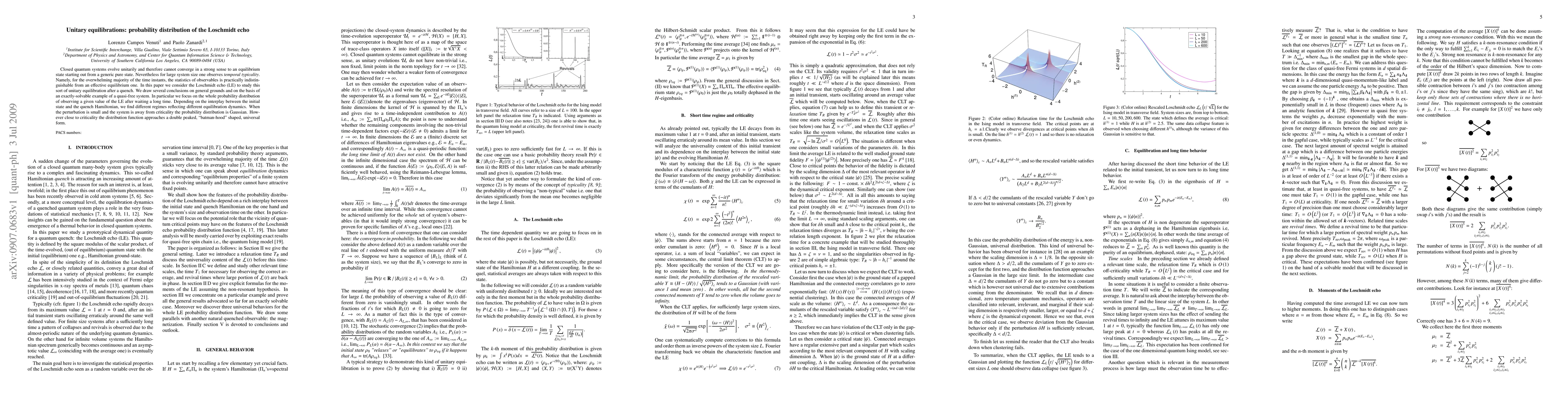 Closed quantum systems evolve unitarily and therefore cannot converge in a strong sense to an equilibrium state starting out from a generic pure state. Nevertheless for large system size one observes temporal typicality. Namely, for the overwhelming majority of the time instants, the statistics of observables is practically indistinguishable from an effective equilibrium one. In this paper we consider the Loschmidt echo (LE) to study this sort of unitary equilibration after a quench. We draw several conclusions on general grounds and on the basis of an exactly-solvable example of a quasi-free system. In particular we focus on the whole probability distribution of observing a given value of the LE after waiting a long time. Depending on the interplay between the initial state and the quench Hamiltonian, we find different regimes reflecting different equilibration dynamics. When the perturbation is small and the system is away from criticality the probability distribution is Gaussian. However close to criticality the distribution function approaches a double peaked, "batman-hood" shaped, universal form.