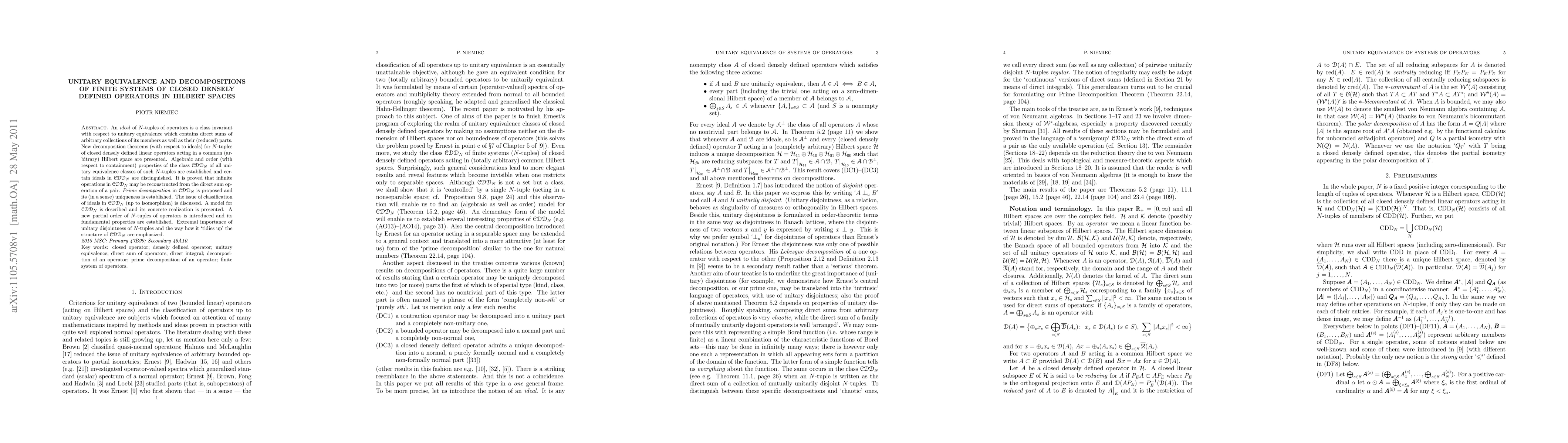 This paper investigates decomposition theorems for finite systems of closed densely defined operators in Hilbert spaces, establishing key properties and ideals within a class of unitary equivalence classes.
