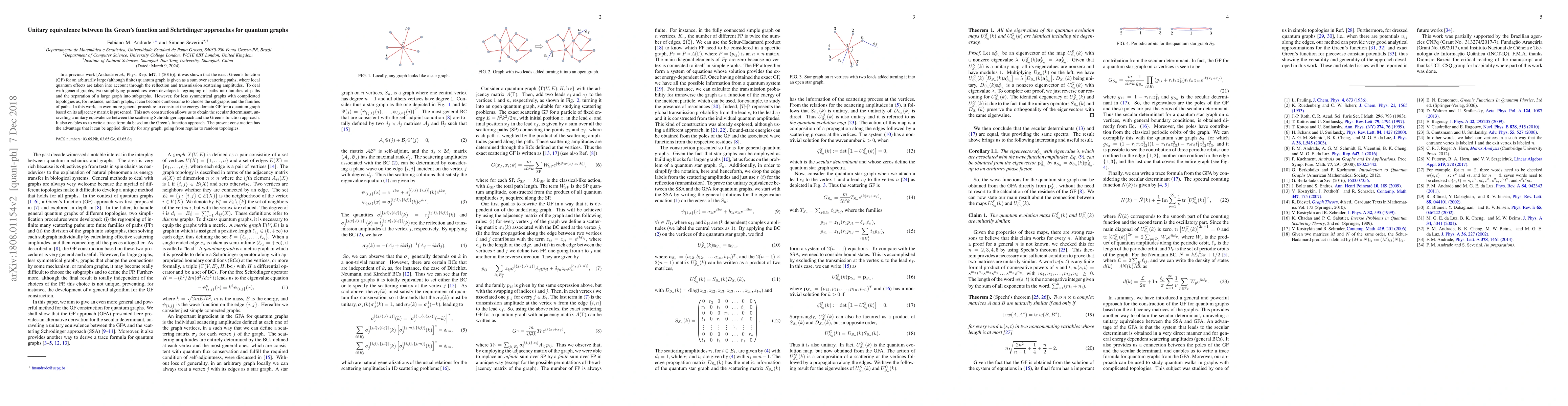 In a previous work [Andrade \textit{et al.}, Phys. Rep. \textbf{647}, 1 (2016)], it was shown that the exact Green's function (GF) for an arbitrarily large (although finite) quantum graph is given as a sum over scattering paths, where local quantum effects are taken into account through the reflection and transmission scattering amplitudes. To deal with general graphs, two simplifying procedures were developed: regrouping of paths into families of paths and the separation of a large graph into subgraphs. However, for less symmetrical graphs with complicated topologies as, for instance, random graphs, it can become cumbersome to choose the subgraphs and the families of paths. In this work, an even more general procedure to construct the energy domain GF for a quantum graph based on its adjacency matrix is presented. This new construction allows us to obtain the secular determinant, unraveling a unitary equivalence between the scattering Schr\"odinger approach and the Green's function approach. It also enables us to write a trace formula based on the Green's function approach. The present construction has the advantage that it can be applied directly for any graph, going from regular to random topologies.
