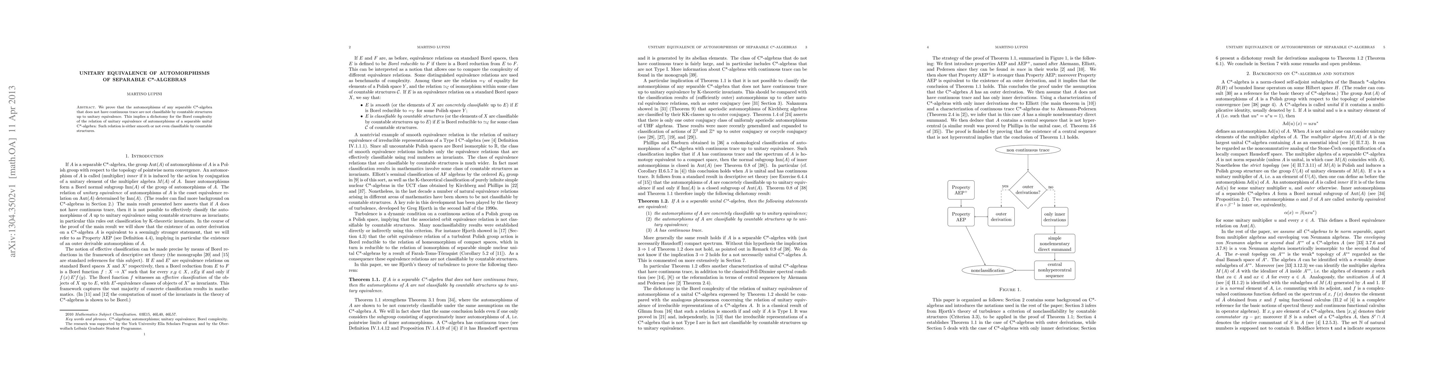 This paper demonstrates that automorphisms of separable C*-algebras without continuous trace cannot be classified by countable structures up to unitary equivalence, leading to a dichotomy in the Borel complexity of the unitary equivalence relation for such algebras.