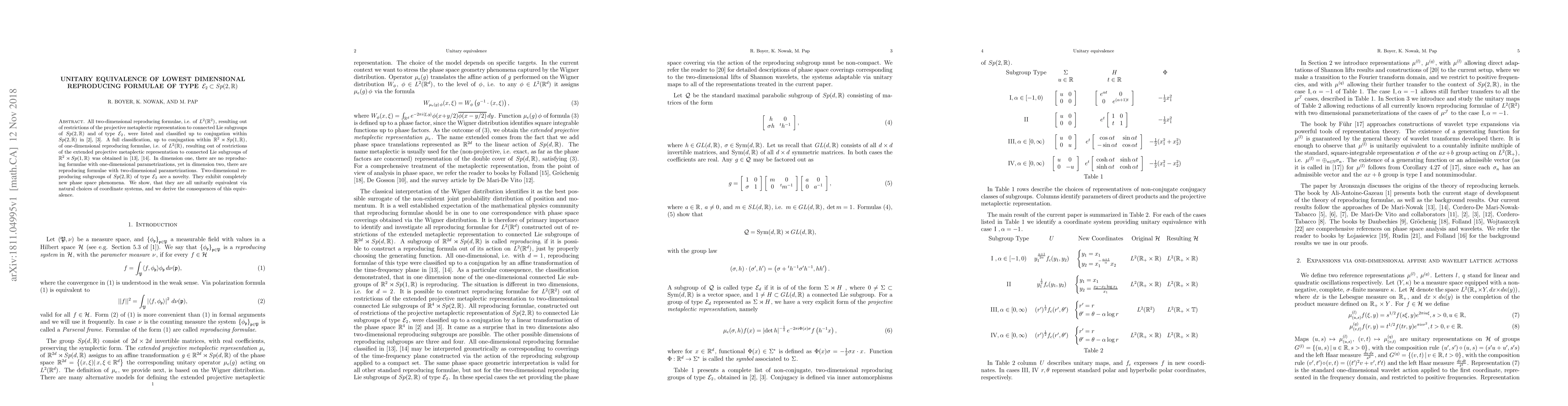 All two-dimensional reproducing formulae, i.e. of $L^2({\mathbb R}^2)$, resulting out of restrictions of the projective metaplectic representation to connected Lie subgroups of $Sp(2,{\mathbb R})$ and of type $\mathcal{E}_2$, were listed and classified up to conjugation within $Sp(2,{\mathbb R})$ in [2], [3]. A full classification, up to conjugation within ${\mathbb R}^2 \rtimes Sp(1,{\mathbb R})$, of one-dimensional reproducing formulae, i.e. of $L^2({\mathbb R})$, resulting out of restrictions of the extended projective metaplectic representation to connected Lie subgroups of ${\mathbb R}^2 \rtimes Sp(1,{\mathbb R})$ was obtained in [13], [14]. In dimension one, there are no reproducing formulae with one-dimensional parametrizations, yet in dimension two, there are reproducing formulae with two-dimensional parametrizations. Two-dimensional reproducing subgroups of $Sp(2,{\mathbb R})$ of type $\mathcal{E}_2$ are a novelty. They exhibit completely new phase space phenomena. We show, that they are all unitarily equivalent via natural choices of coordinate systems, and we derive the consequences of this equivalence.