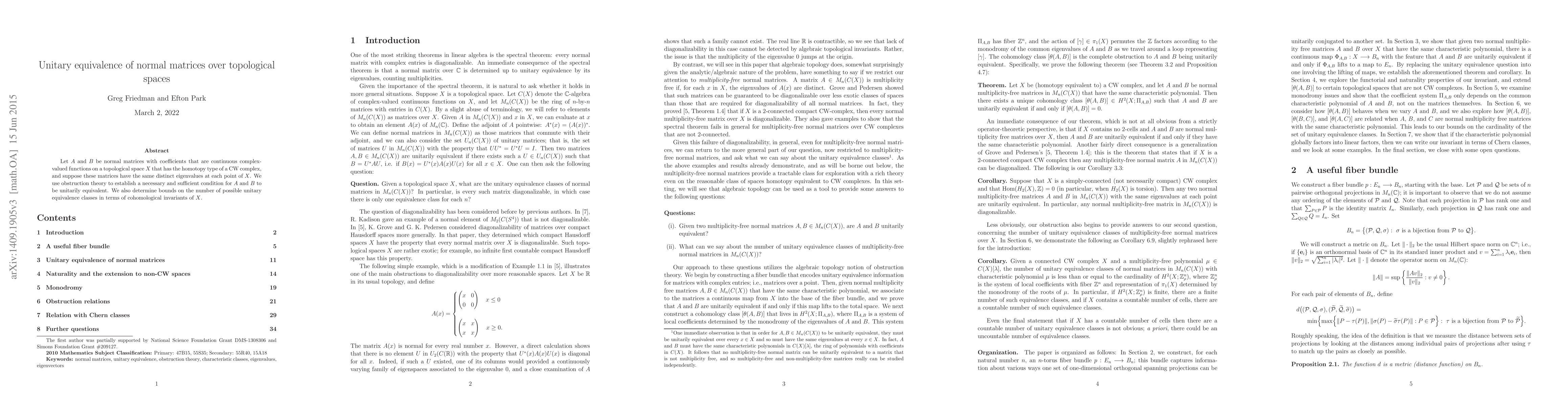 This paper establishes necessary and sufficient conditions for unitarily equivalent normal matrices with continuous complex-valued coefficients on a topological space X, using obstruction theory. It also determines bounds on the number of unitary equivalence classes based on cohomological invariants of X.