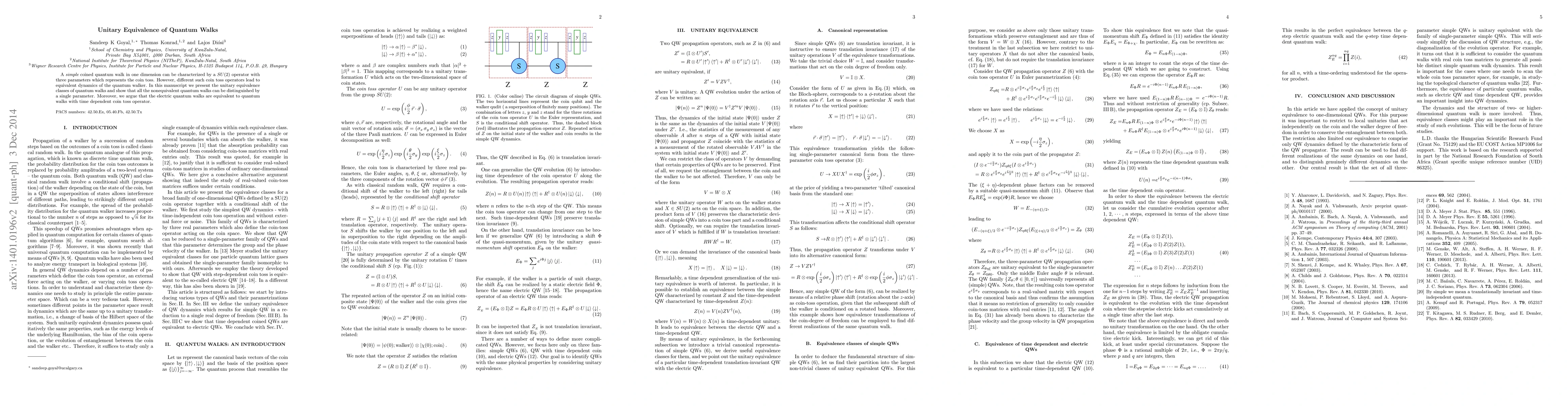 This paper explores the unitary equivalence classes of one-dimensional quantum walks, demonstrating that different coin toss operators can lead to equivalent dynamics. It concludes that all nonequivalent quantum walks can be distinguished by a single parameter and that electric quantum walks are equivalent to those with time-dependent coin operators.